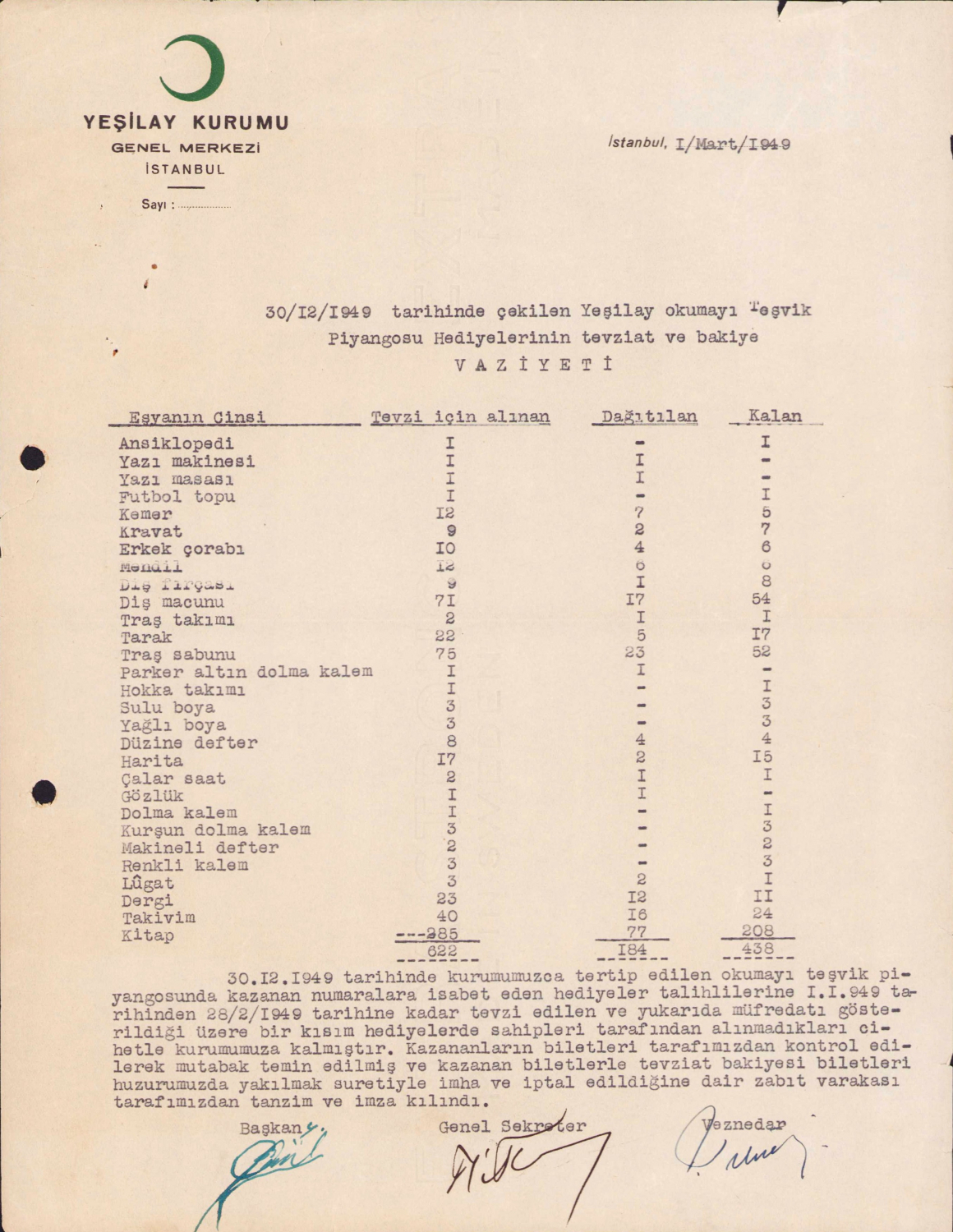Yeşilay Kurumu, 1949 tarihinde çekilen Yeşilay Okumayı Teşvik Piyangosu hediyelerinin tevziat ve bakiye vaziyeti, ıslak imzalı, 23x30cm