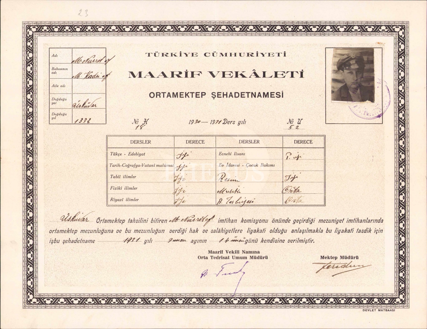 T. C. Maarif Vekaleti Ortamektep Şehadetnamesi, 1931, 34x21 cm