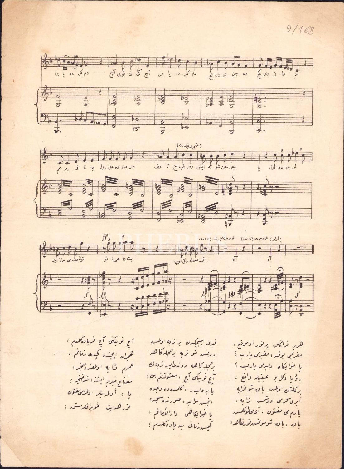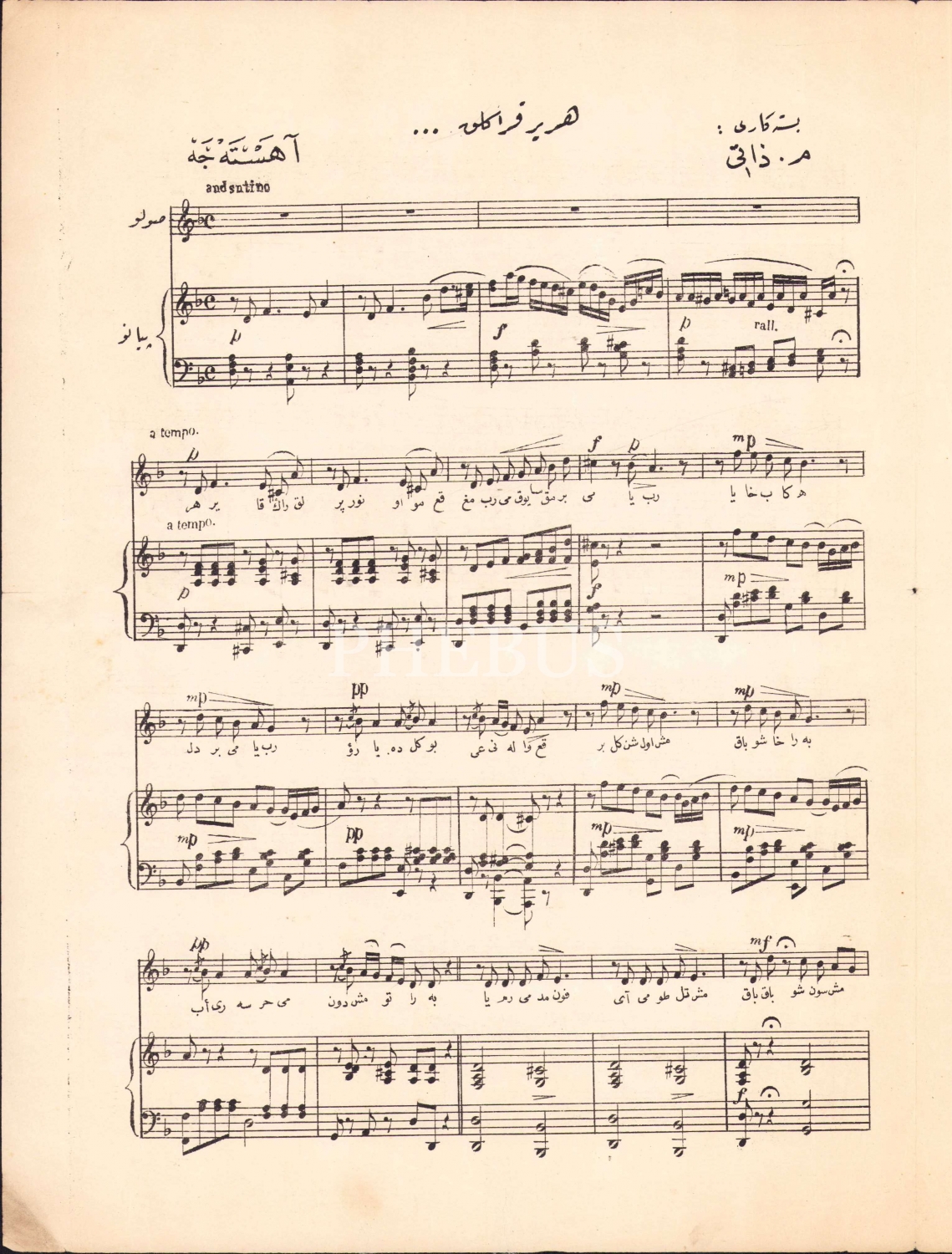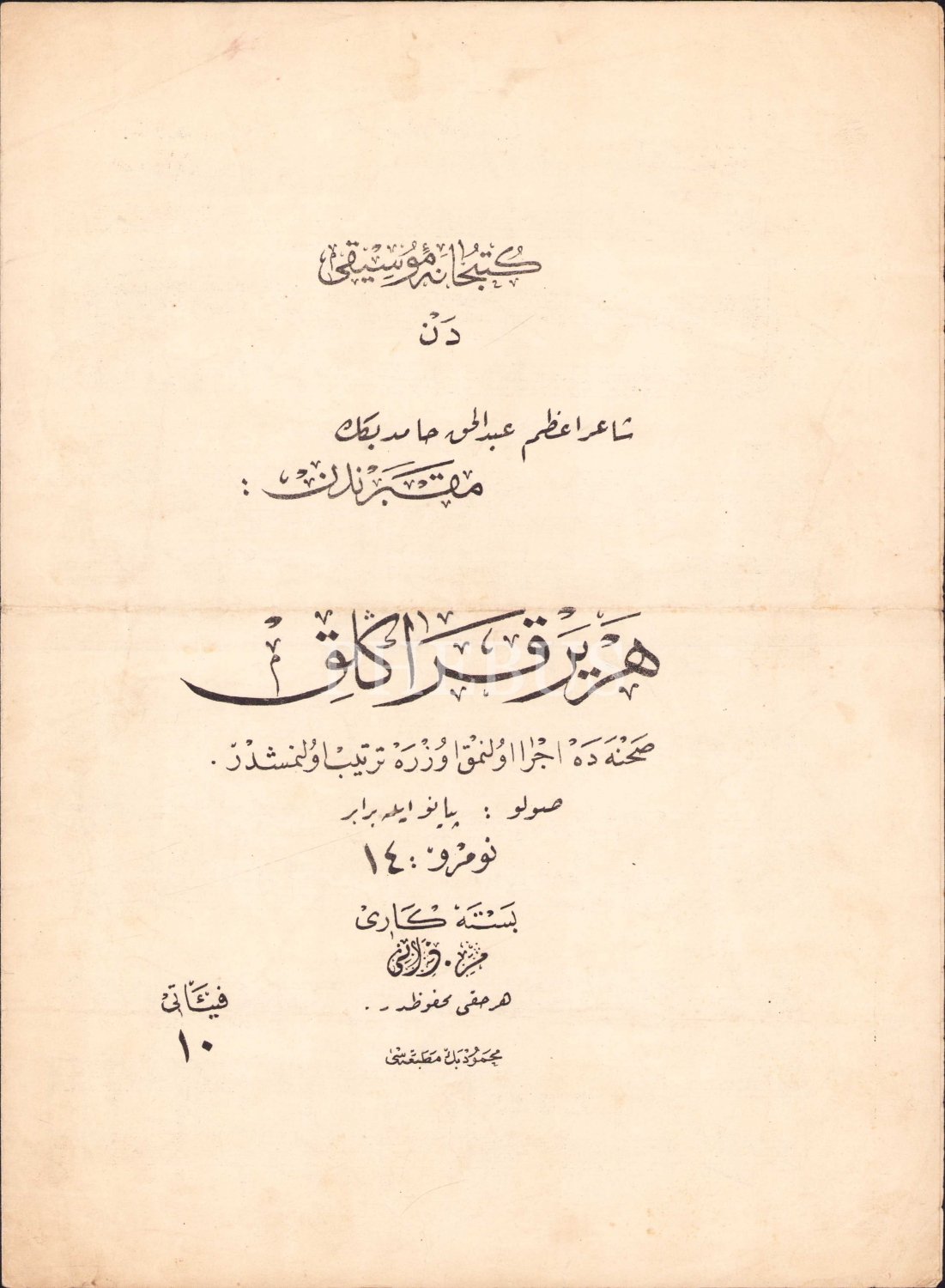 Osmanlıca nota, Kütüphane Musikiyeden Şair-i Azam Abdülhak Hamid Bey'e Makberinden "Her Yer Karanlık", bestekar M. Zati, 4 sayfa, 25x34 cm