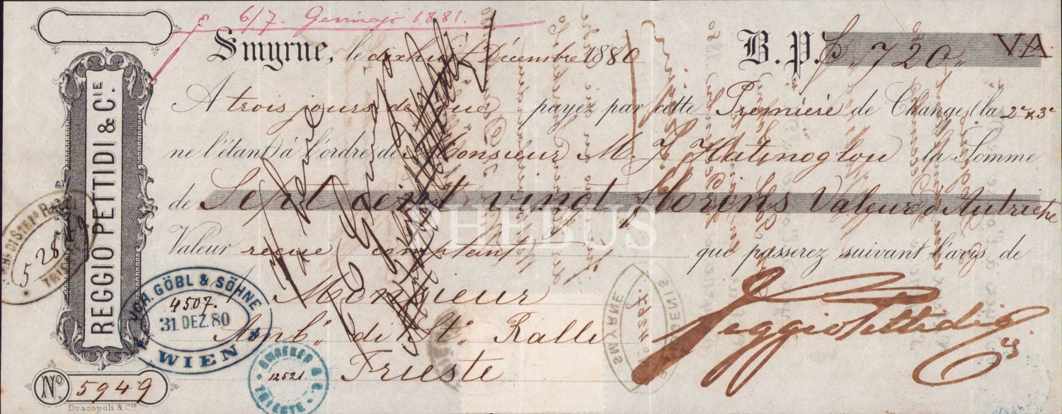 Fransızca çek, Reggio Pettidi & Cie., Smyrne - İzmir 1880, 28x10 cm