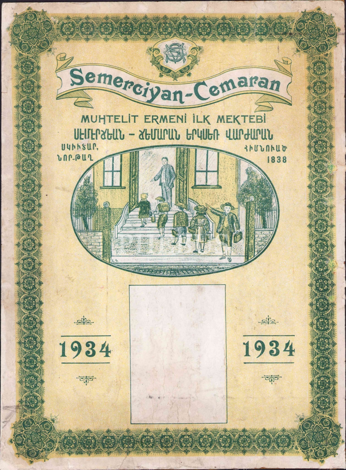 Semerciyan Muhtelif Ermeni İlk Mektebi 1934 takvim kartonu, Türkçe - Ermenice iki dilde, 27x37 cm