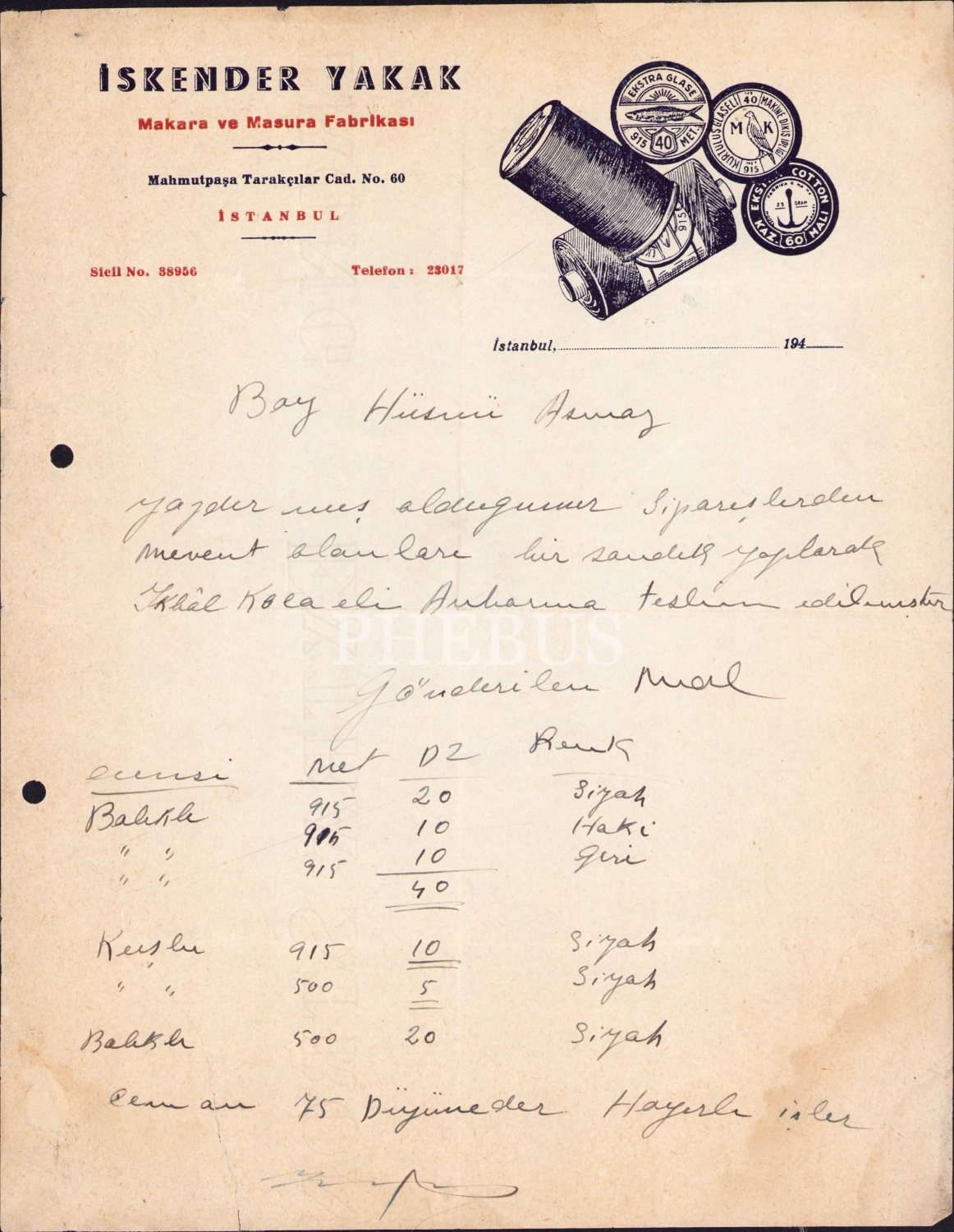 İskender Yakak Makarna ve Masura Fabrikası antetli doküman, 22x29 cm