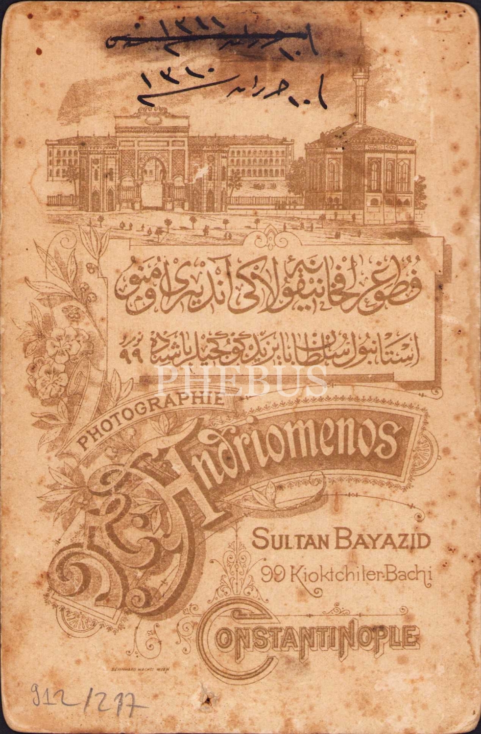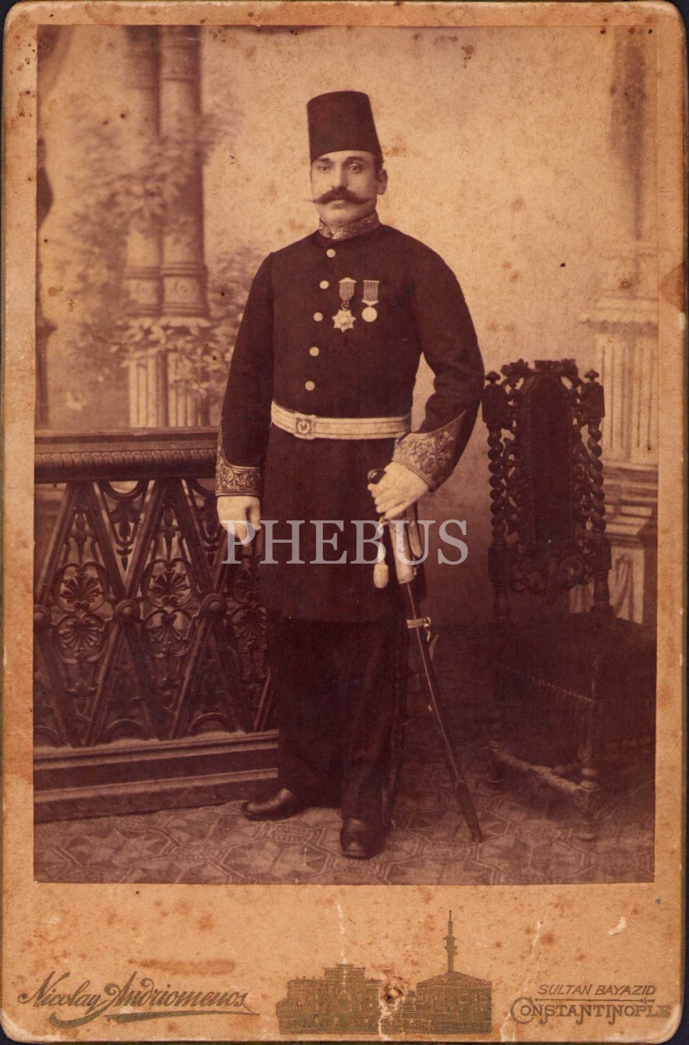 Photo N. Andriomenos kabin fotoğrafı, Osmanlı nişan ve madalyalı subay, Osmanlıca ithaflı 1310 tarihli, 10x13 cm