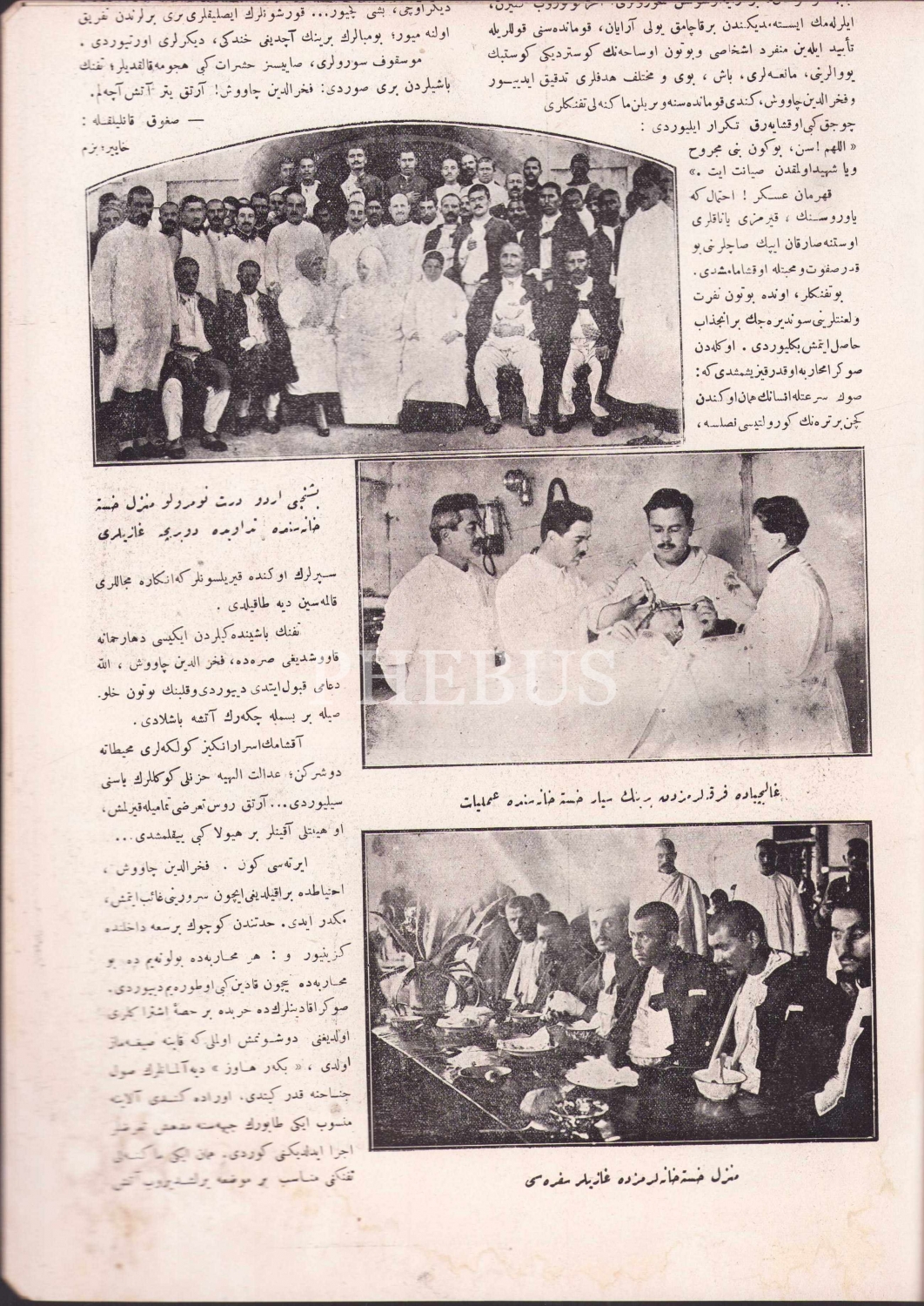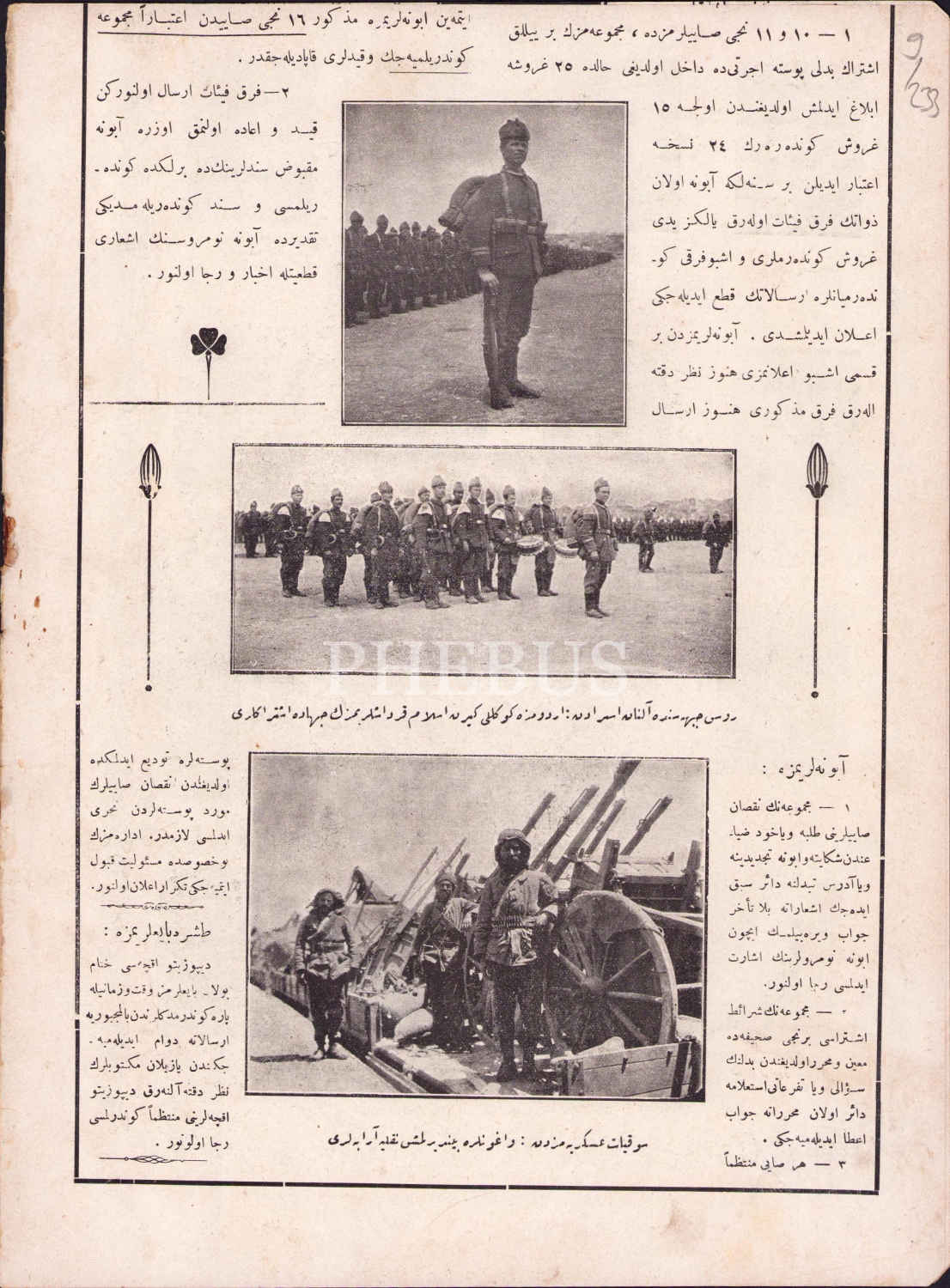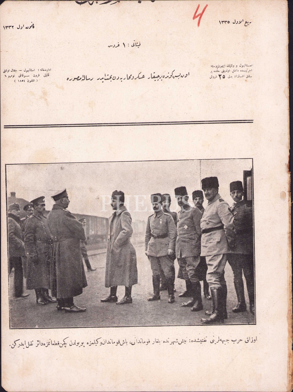 Osmanlıca Askeri mecmua, 1332, kapak " Uzak Harp Cephelerini Teftişinde: Niş şehrinde Bulgar kumandanı, Baş kumandan vekilimize [Enver Paşa] bu yoldan geçen kıtamıza dair naklederken", üst kısım kesik, 14 sayfa, 22x30