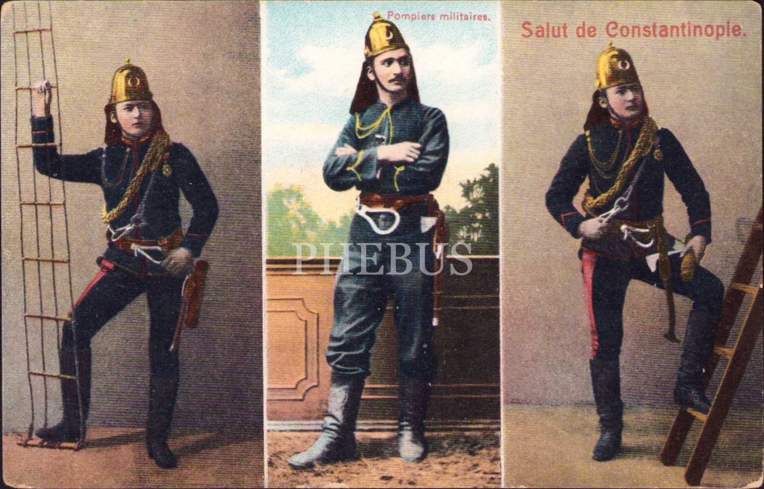 Osmanlıca dönemi meslek, itfaiyeciler, 3 parçalı kartpostal