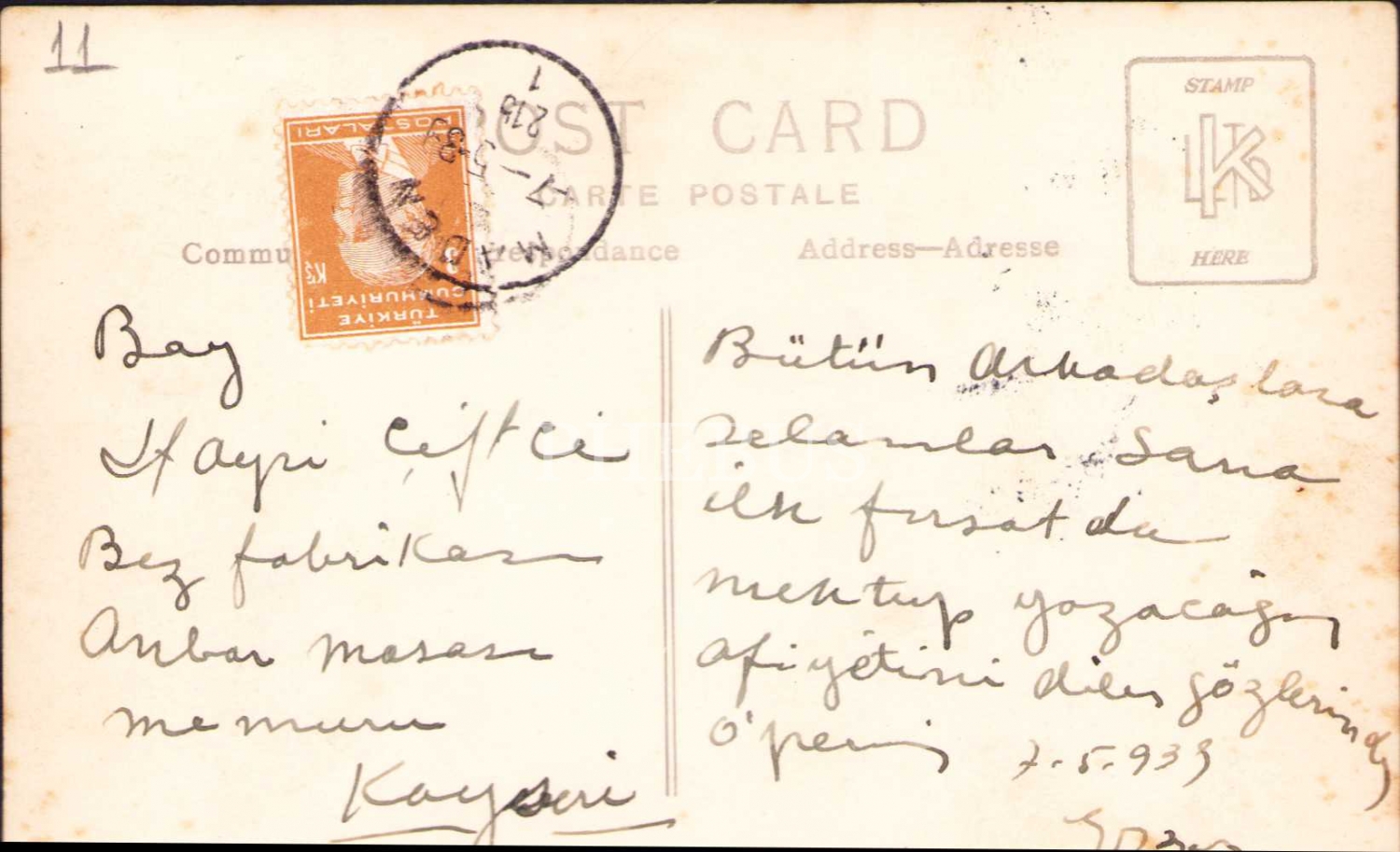 Kayseri 1939, postadan geçmiş, "MADEN" damgalı