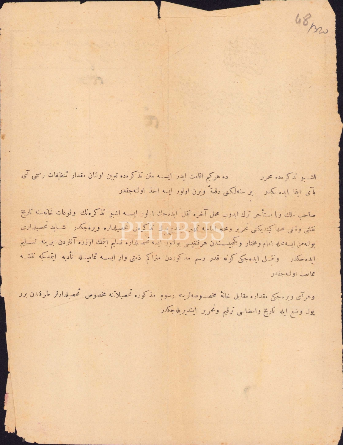 Osmanlıca Şehremaneti, Tenzifat Rüsumuna Mahsus Tezkere, 1328 tarihli, 23x17 cm
