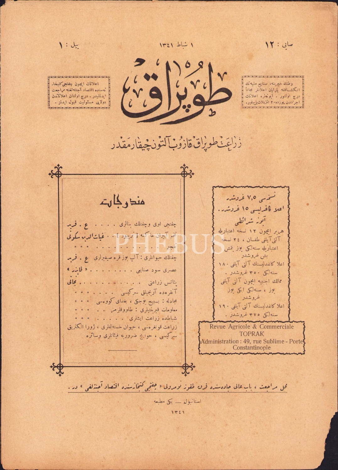 OOsmanlıca Toprak mecmuası, sayı: 12, Yeni Matbaa, İstanbul, 1341, 15 sayfa, 20x28 cm