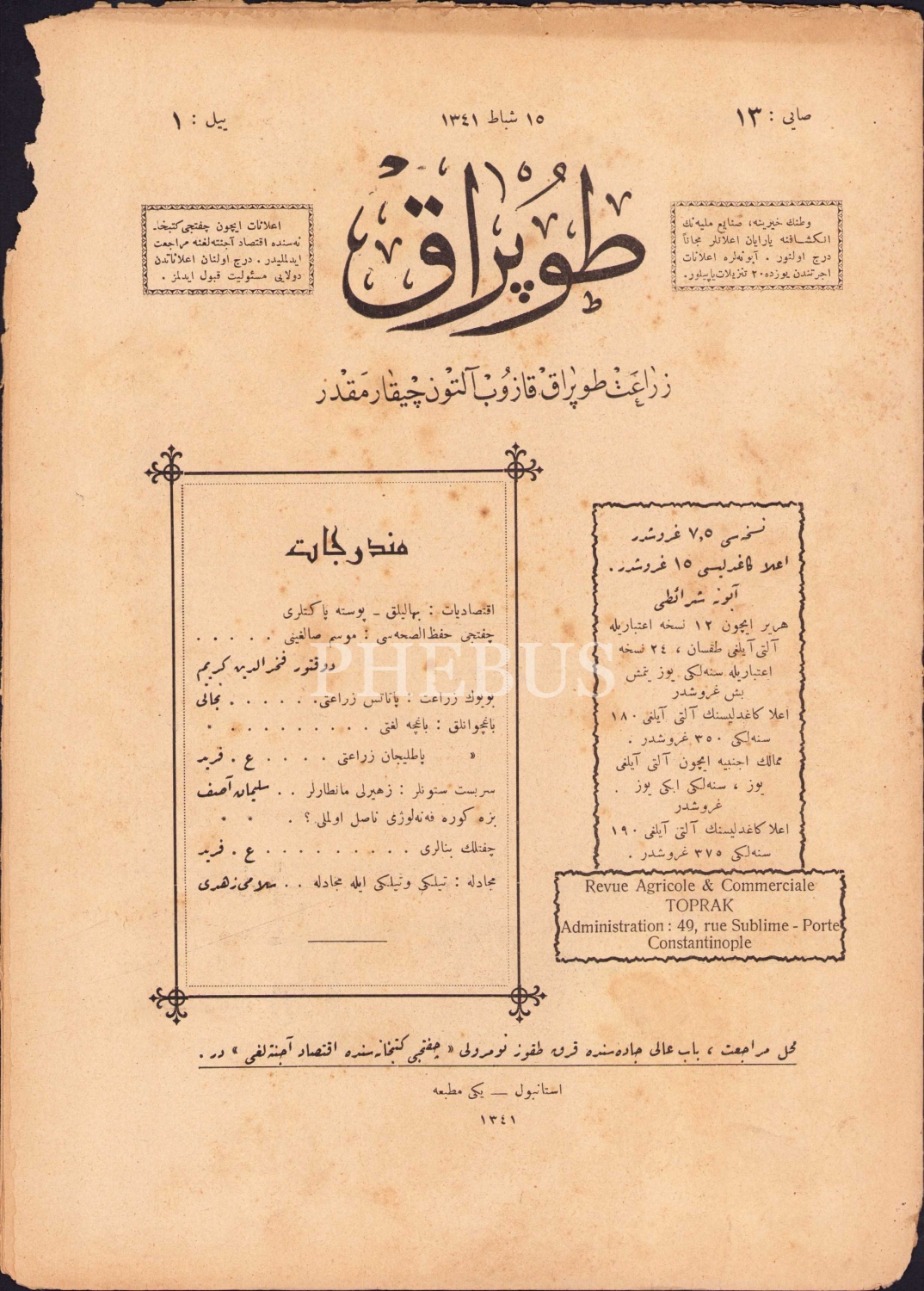 OOsmanlıca Toprak mecmuası, sayı: 12, Yeni Matbaa, İstanbul, 1341, 13 sayfa, 20x28 cm