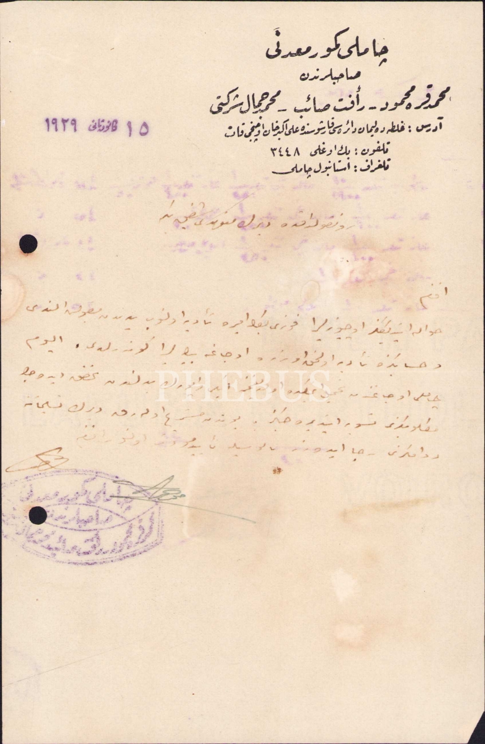 Osmanlıca Çamlı Kömür Madeni sahiplerinden Mehmed Kara Mahmud - Rafet Saib - Mehmed Cemal Şirketi antetli 1929 tarihli doküman, 13x22 cm