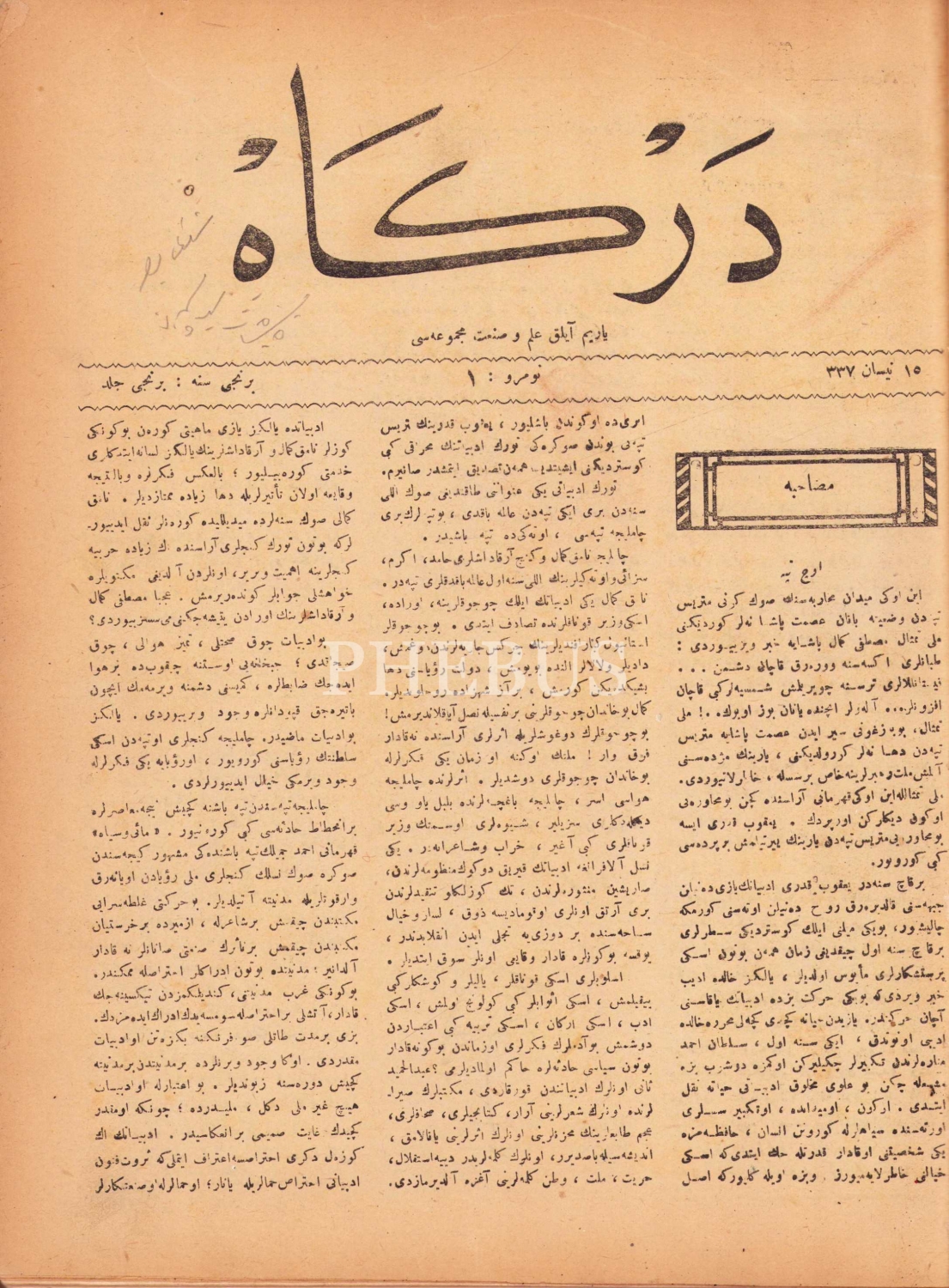 Osmanlıca Dergah - ilim ve sanat mecmuası, 1. sene 1. cilt, 15 Nisan 1337, resimli, sırtı haliyle, 190 sayfa, 22x31 cm