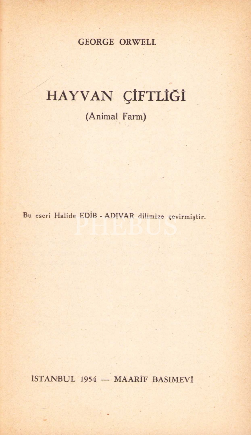 Hayvan Çiftliği, George Orwell, çev., Halide Edip Adıvar, Maarif Matbaası, İstanbul, 1954, 112 sayfa, 12x18 cm
