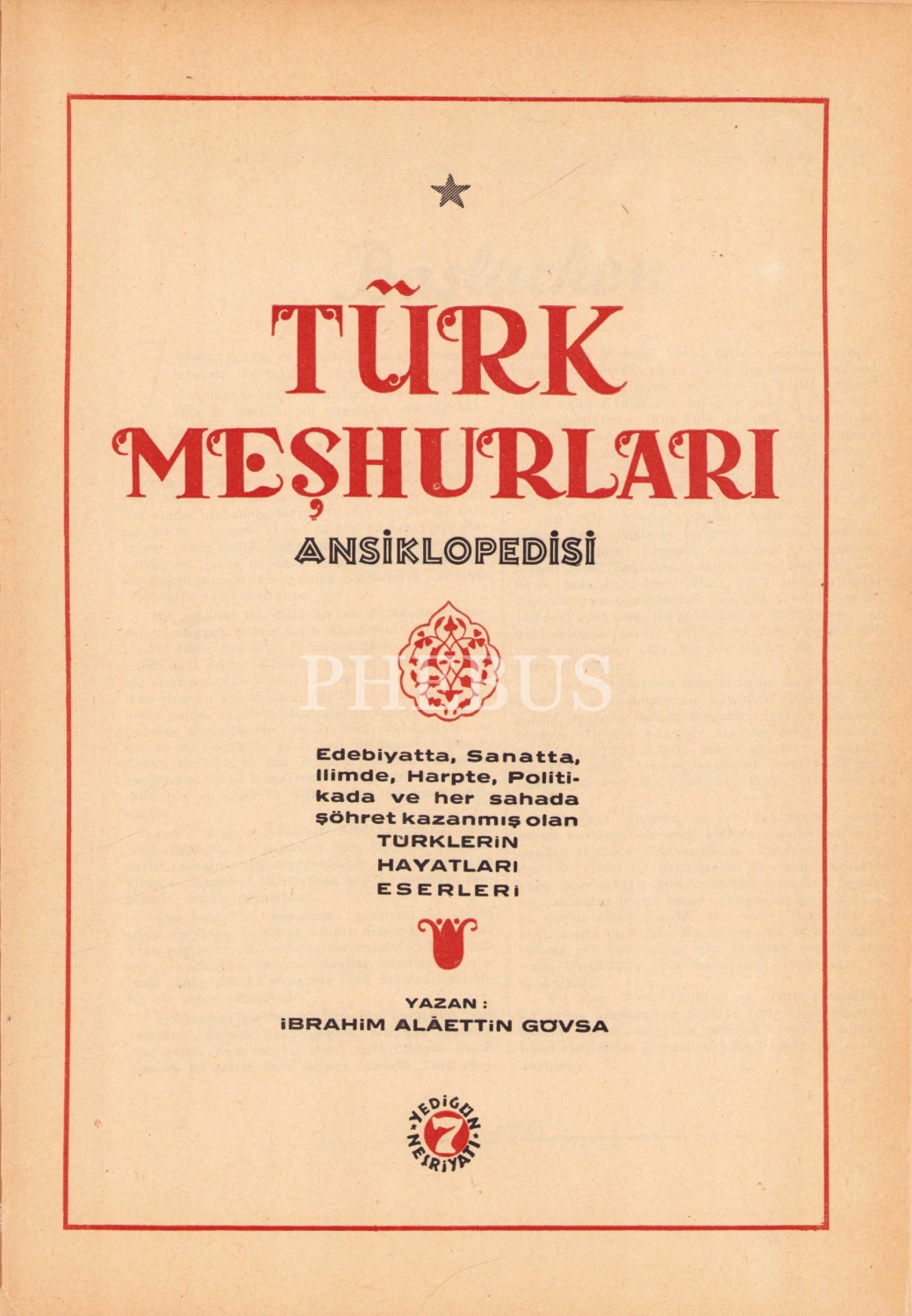 Biyografi ve ansiklopedi çalışmalarıyla tanınan yazar, eğitimci ve şair İbrahim Alaettin Gövsa'nın Türk Meşhurları Ansiklopedisi, Yedigün Neşriyatı, 1962, resimli, 416 sayfa, 20x28 cm