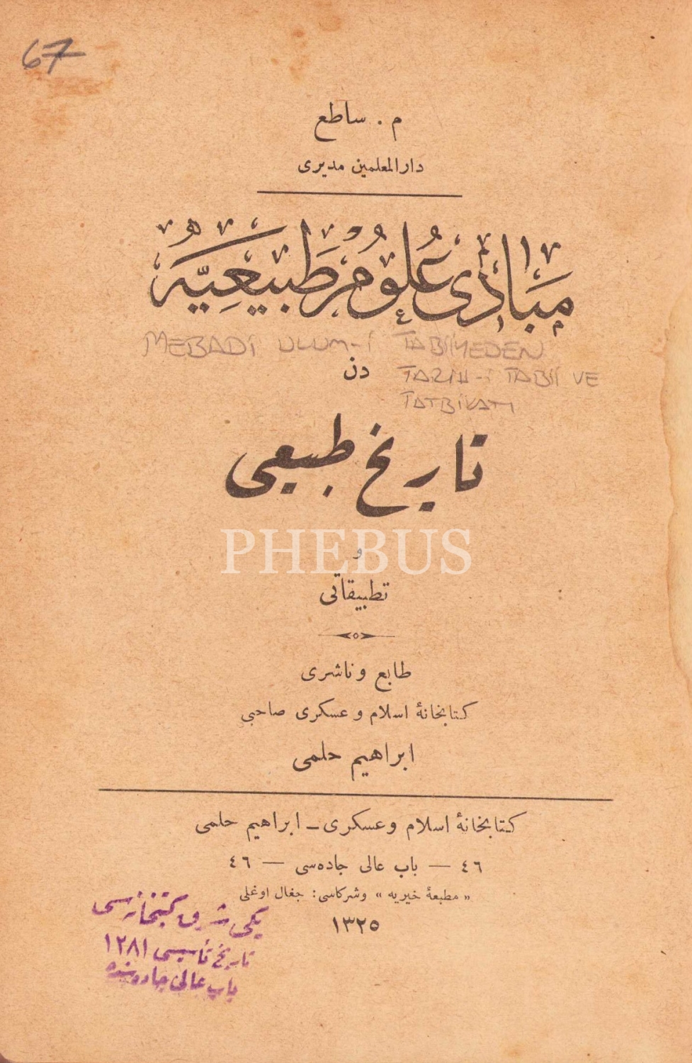 Osmanlıca Mebadi Ulum-i Tabiıyyeden Tarih-i Tabii ve Tatbikatı, M. Satı, Matbaa-i Hayriye, 1325, 147 sayfa, 13x19 cm
