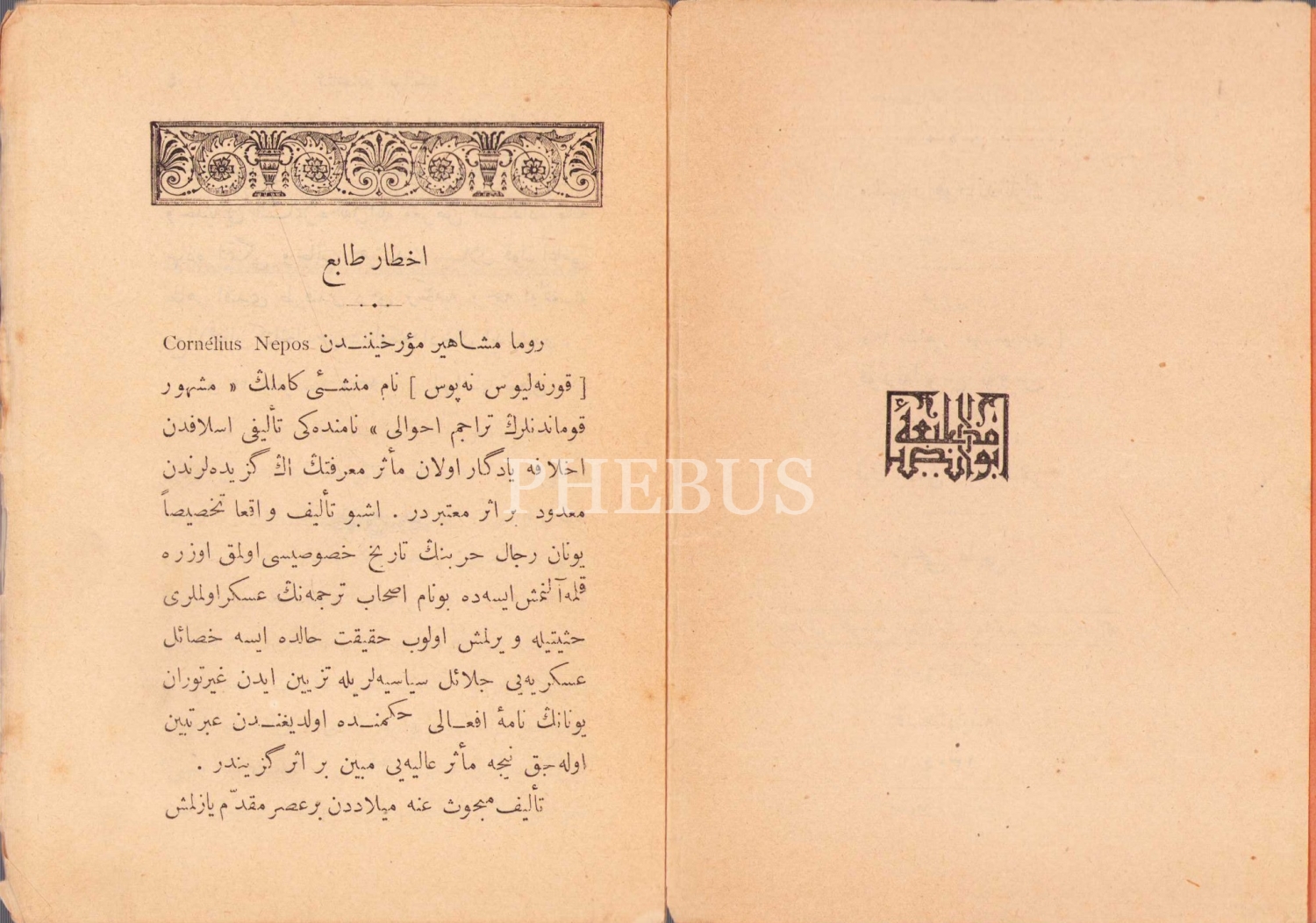 Osmanlıca Meşhur Kumandanların Tercüme-i Ahvali, Cornelius Nepos, çev., Mehmed Tahir, 1. cüz, Matbaa-i Ebuzziya, 1304, 64 sayfa, 10x14 cm