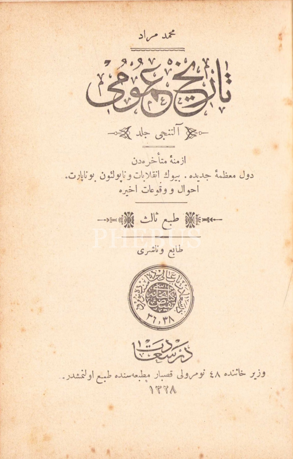 Osmanlıca Tarih-i Umumi - altıncı cilt, Mehmed Murat, üçüncü baskı, Kasbar Matbaası, Dersaadet, 1328, sırtı haliyle, 384, 13x19 cm