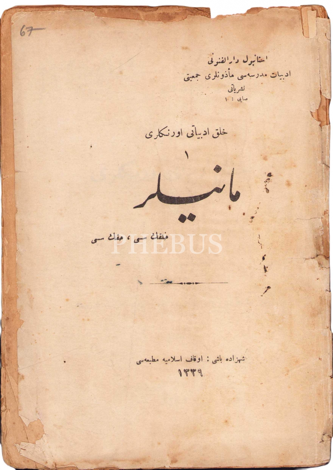 Osmanlıca Halk Edebiyatı Örnekleri 1 Maniler - Birinci Kısım - Halkın Sesi Hakkın Sesi, Evkaf-ı İslamiye Matbaası, 1339, kapak haliyle, 55 sayfa, 13x19 cm, ÖZEGE; 6721