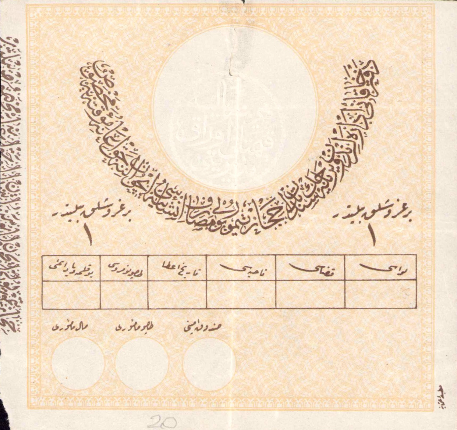 Hazine-i Maliye Kıymetli Evrak Müdiriyeti, defteri hakani idarelerinden verilecek bedelin Hicaz demiryolu mesariif inşası için alınacak ianeyi muvakkateye mahsus yardım makbuzu, 14x14cm