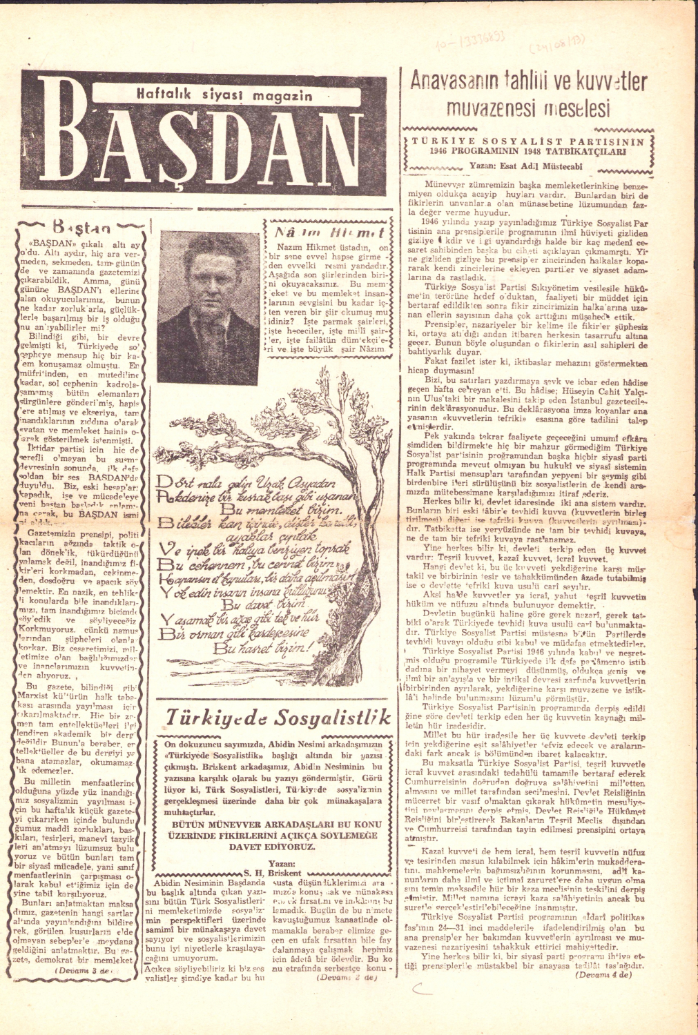 Başdan - Haftalık siyasi magazin, 21 Aralık 1948 tarihli baskı, Kapakta Nazım Hikmet'in resmi ile karşılaştırma yazısı ve "Bu memleket bizim" şiiri, 4 sayfa, 30x43cm
