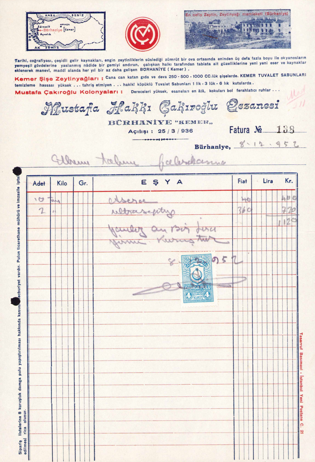 Mustafa Hakkı Çakıroğlu Eczanesi fatura, Balıkesir Burhaniye Zeytinyağları, Kolonyaları 1952 tarihli, Tasarruf Basımevi - İstanbul Yeni Postahane, 20x29cm