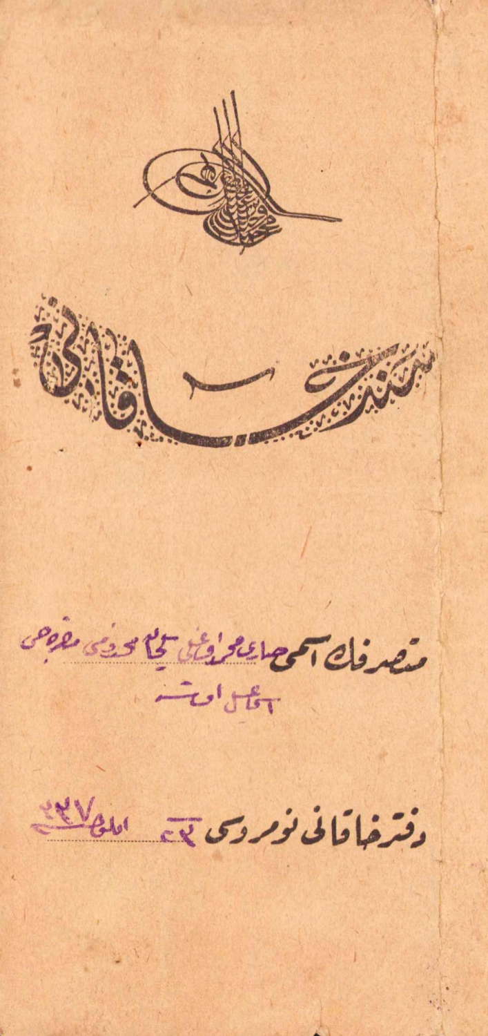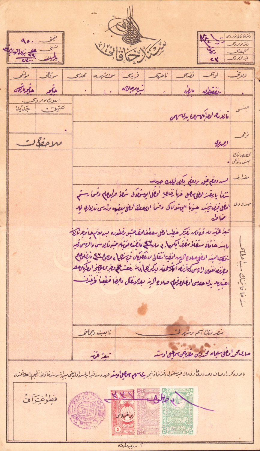 1337 tarihli Malatyaya ait sened-i hakani (tapu senedi), pullu mühürlü, katlamalı, 8x19cm