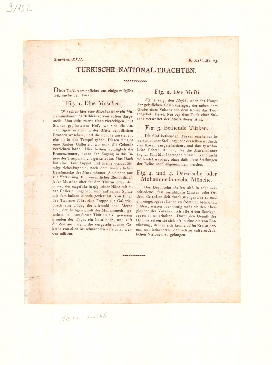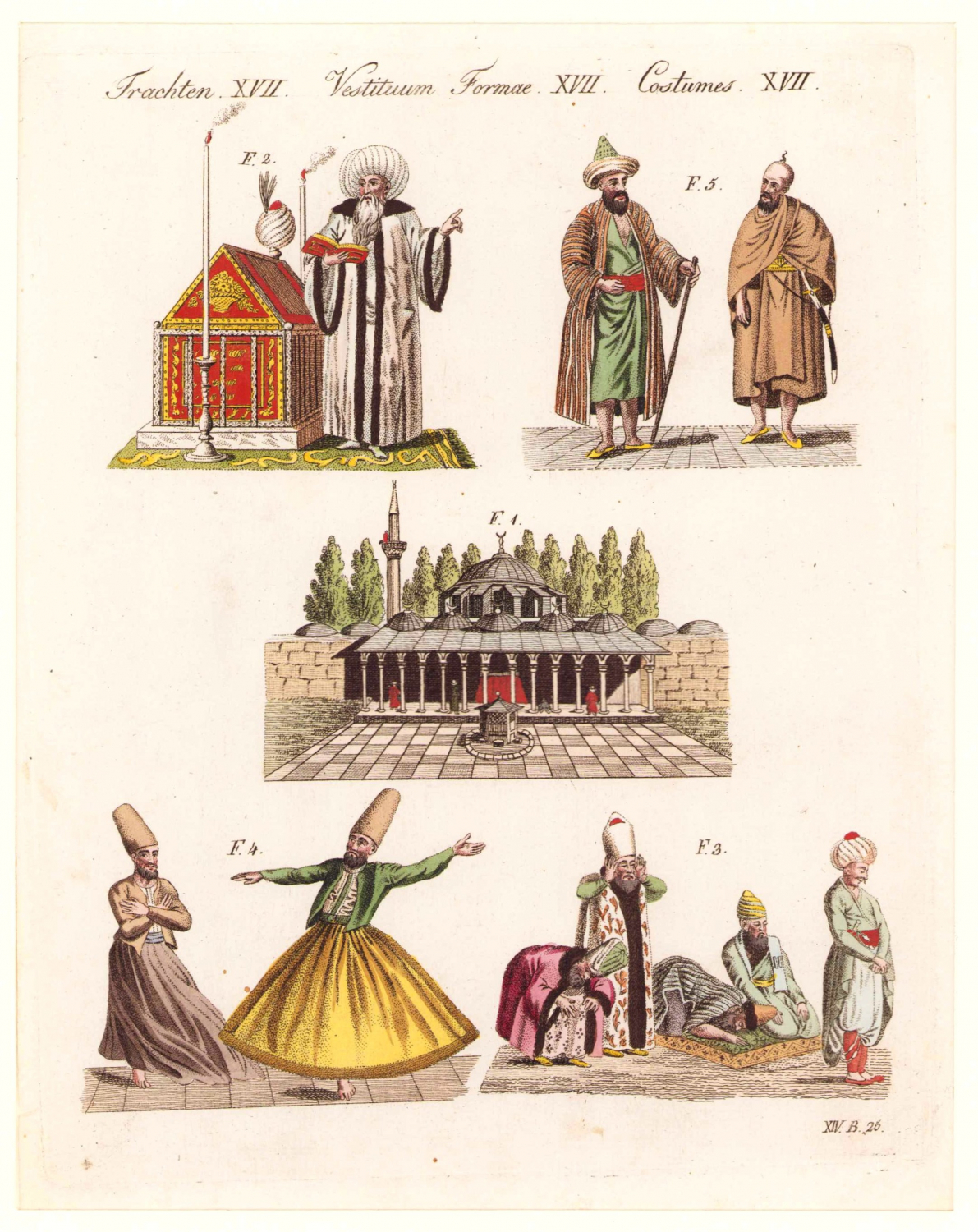 Almanca 1810 tarihli Türk Ulusal kıyafetleri gravürü, cami, müftü, ibadet eden türkler, dervişler, 26x35cm