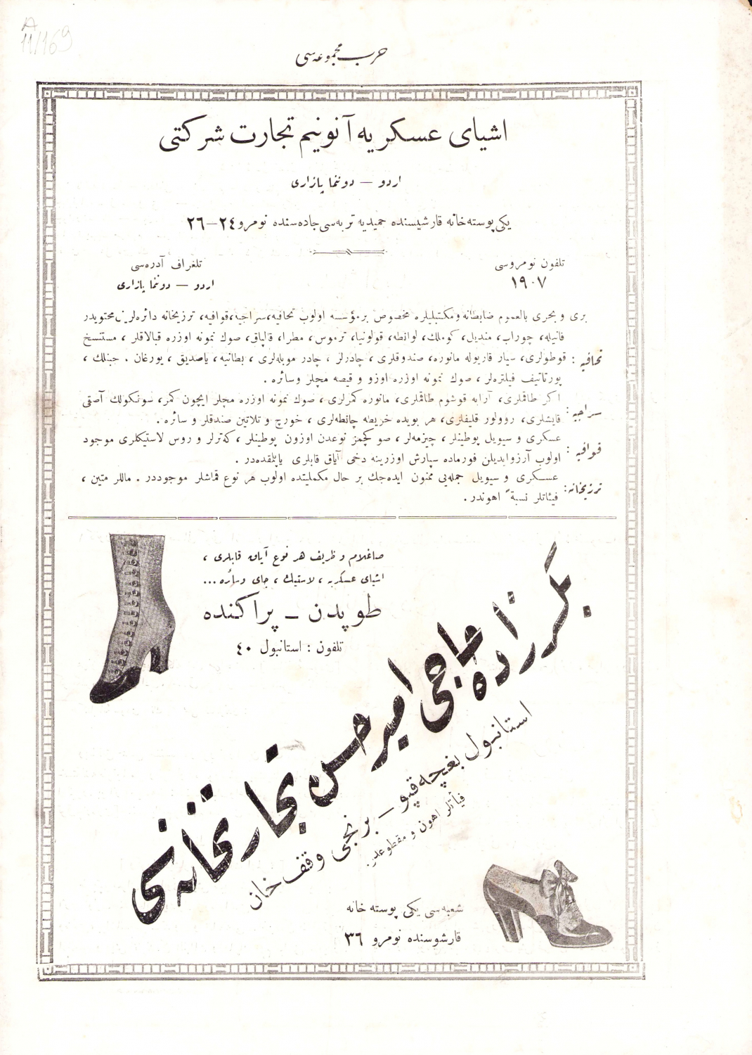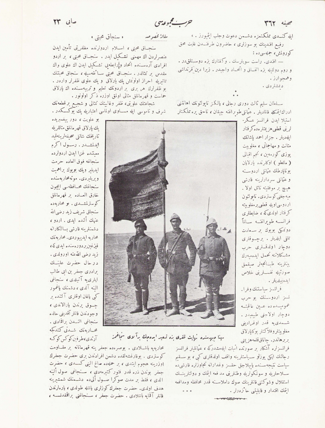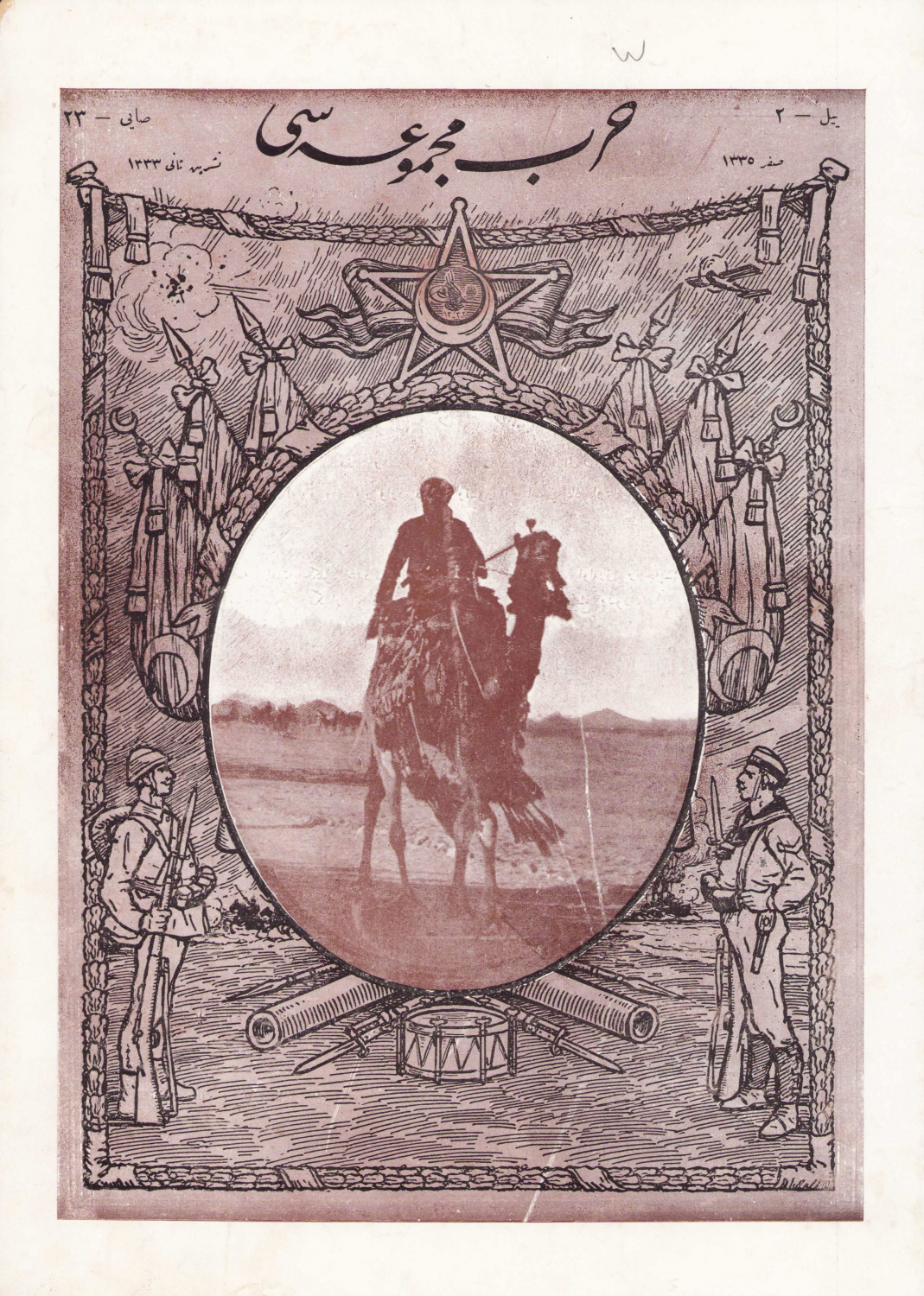 Osmanlı 1335 tarihli Harb Mecmuası, 23.sayı , iç kapak 46 ve 55 sancaklarına Ravza-i muatahharada muharebe madalyaları takıldıktan sonra alayların Mescidi saadetten Babüsselama çıkışı, arka kapak Eşyayı Askeriye Anonim Ticaret Şirketi ve Bekirzade Hacı Em