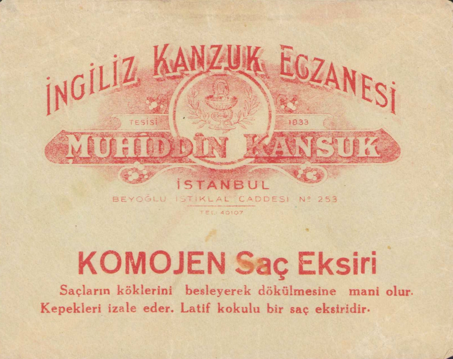 İngiliz Kanzuk Eczanesi antetli zarf, Komojen Saç Eksiri, Muhiddin Kansuk, İstanbul, 14x11cm