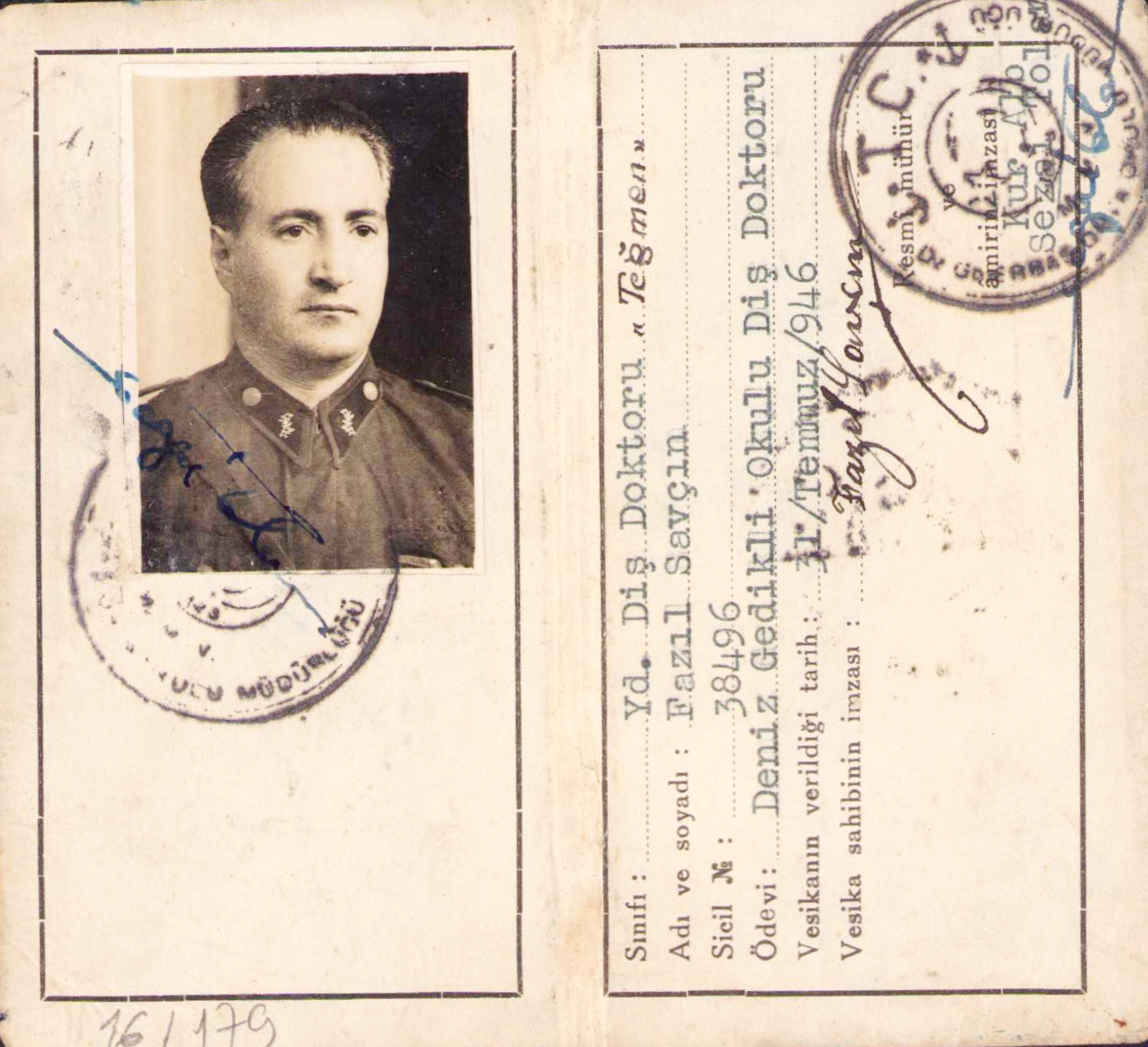 1946 tarihli Deniz Gedikli Okulu Diş Doktoru Teğmen Fazıl Savçın'ın Vesikası, ıslak imzalı damgalı, 6x12cm