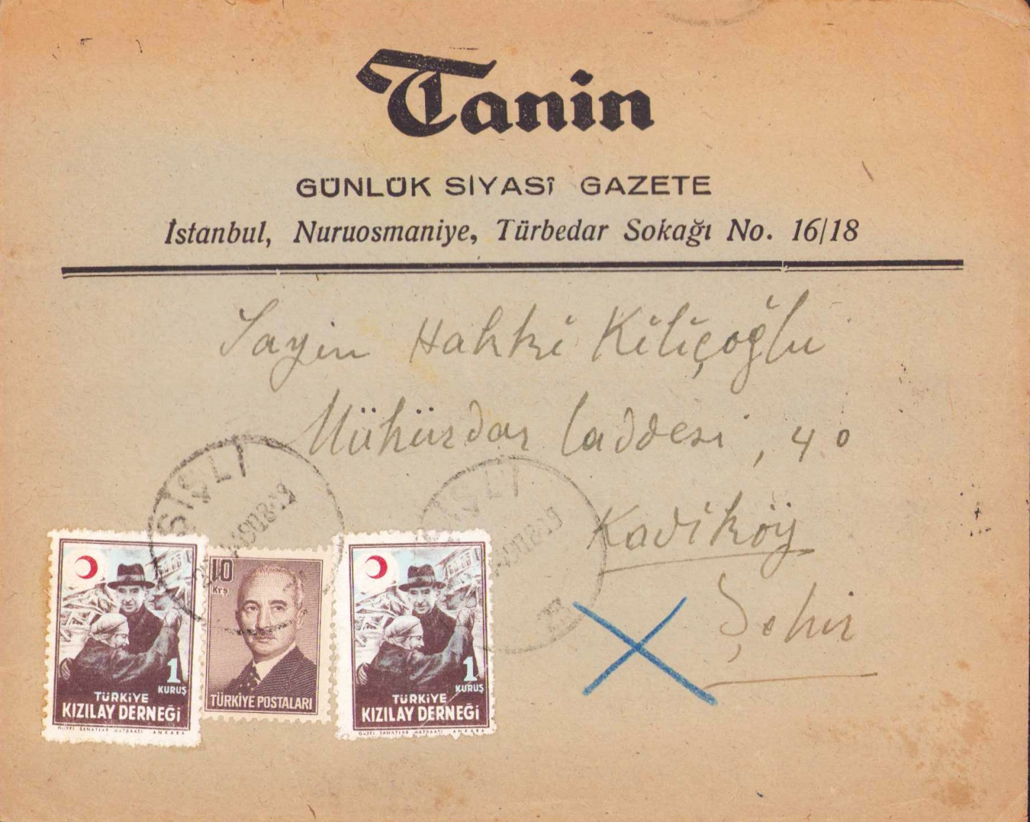 Tanin Günlük siyasi gazetesi antetli zarf ve Hakkı Kılıçoğlu'na gönderilen mektup, Türkiye kızılay derneği pullu, İstanbul