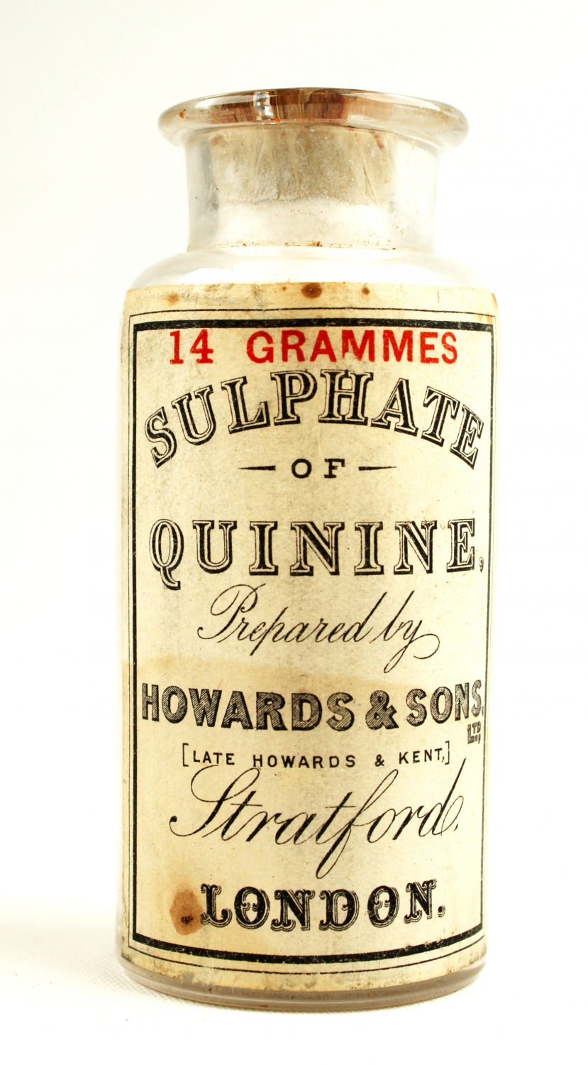 Tıp, Londra etiketli içi dolu Kinin Sülfat şişesi, 10x4,5 cm