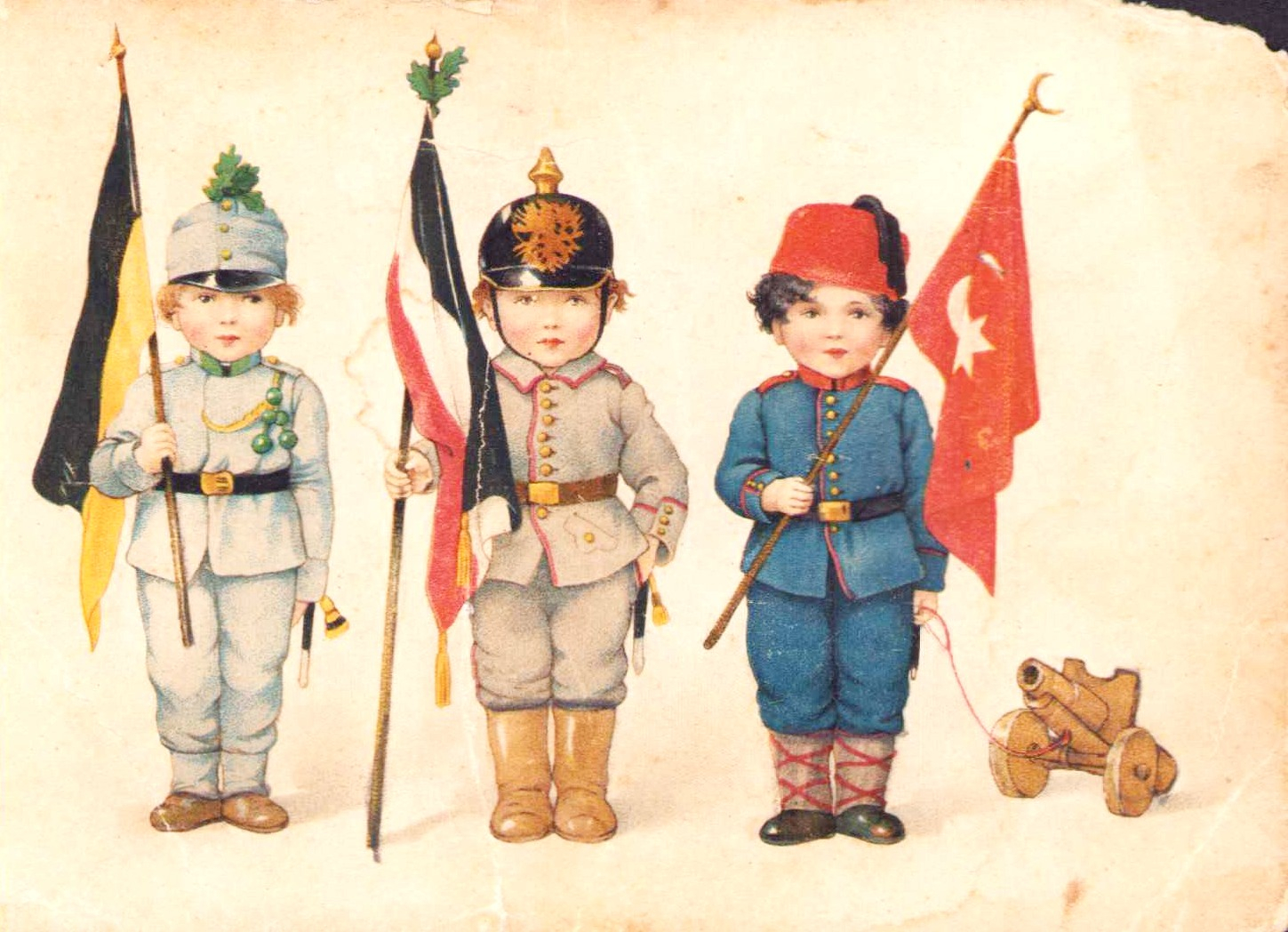 İttifak Kartpostalı Türkiye, Türkiye, Almanya ve Avusturya Macaristan bayrağı detaylı, kenaları kopuk haliyle, editör Druck U. Verlag Von B. Donborf, Frankfurt, arkası Osmanlıca menü yazılı