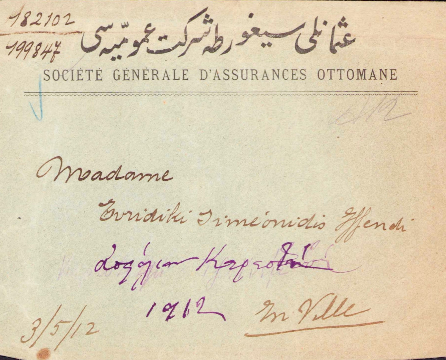 Osmanlı sigorta şirketi umumiyesi antetli Osmanlıca - Fransızca yazılı 1912 tarihli zarf