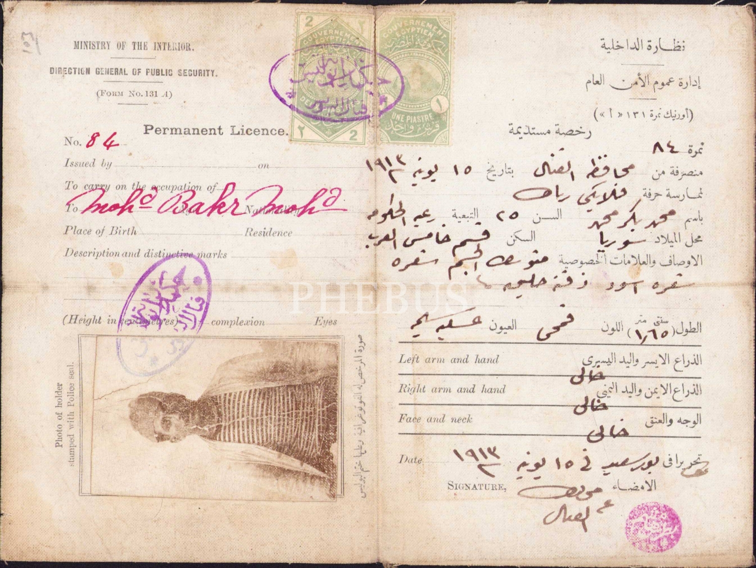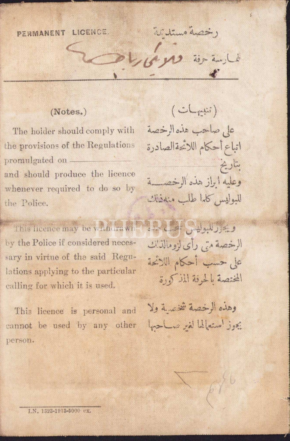 Arapça - İngilizce kalıcı lisans belgesi, 1913, 21x17 cm