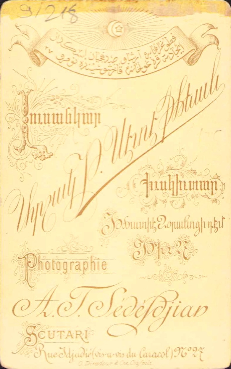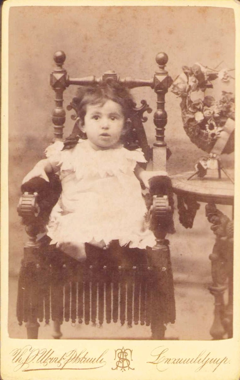 Koltukta oturan bebek, stüdyo çekim kabin fotoğrafı, Fotoğrafhane Sedefjian, Üsküdar (Scutari) ( üç farklı dilde yazılı Osmanlıca, Ermenice, Fransızca) küçük boy 6,5x10