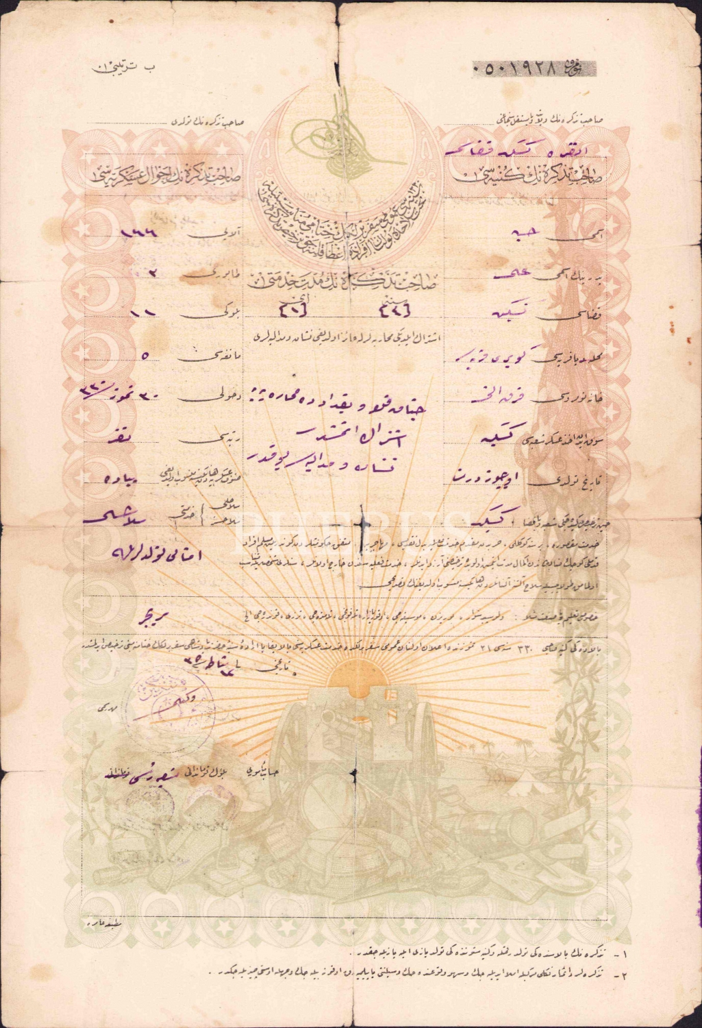 Osmanlıca seferberlikte silah altına alınacak efra ait terhis belgesi, Çanakkale Muhaberesine iştirak etmiş olan Keskinli Hasan Efendi, 1335, haliyle, 22x35 cm