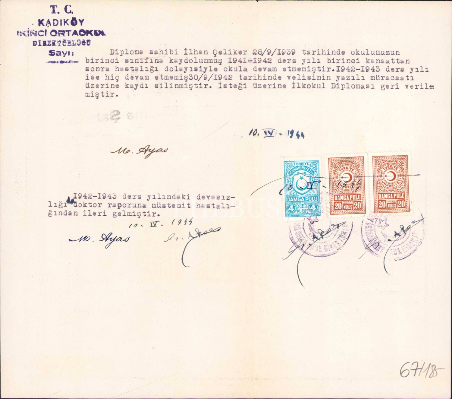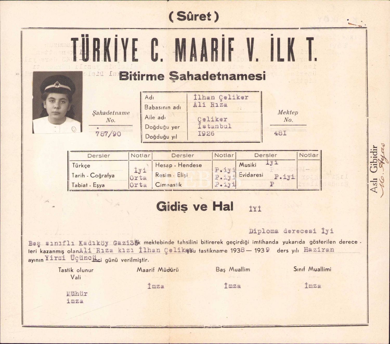 Türkiye Cumhuriyeti Maarif V. İlk T. bitirme şahadetnamesi sureti, İlhan Çeliker, 1939, 23x20 cm