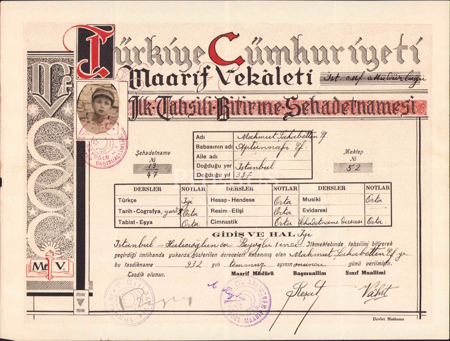 T. C. Maarif Vekaleti İlk Tahsin Bitirme Şehadetnamesi, 1932, 29x22 cm