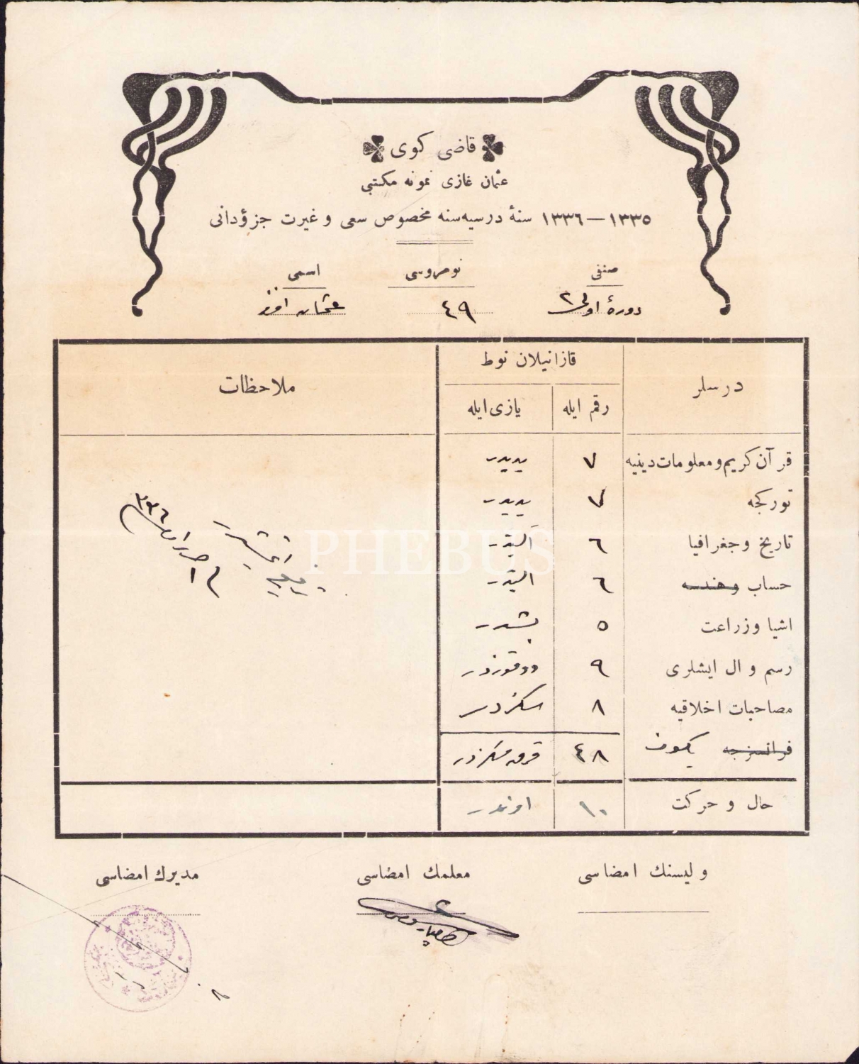 Osmanlıca Kadıköy Osman Gazi Numune Mektebi karne, 1335, 16x21 cm