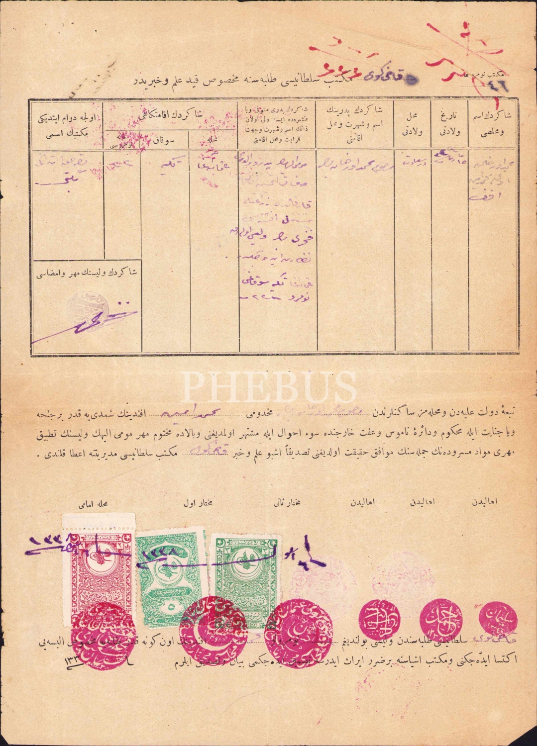 Osmanlıca Kadıköy Mektebi Sultani talebe kayıt ilmühaberi, 1338, 20x28 cm