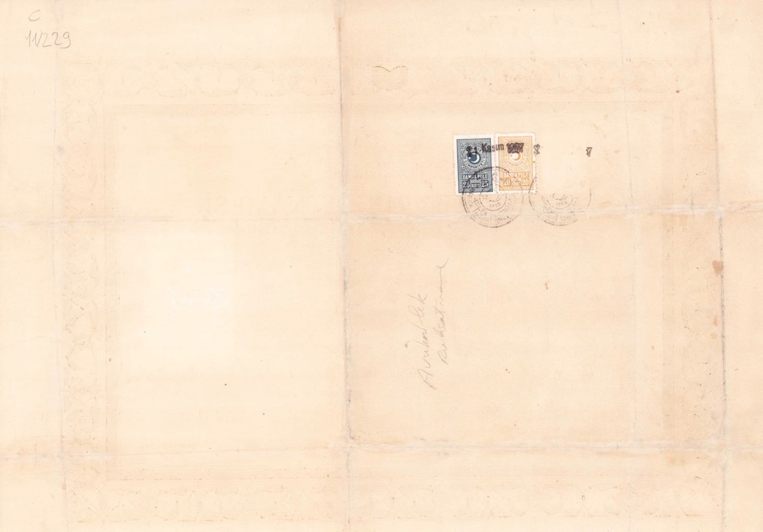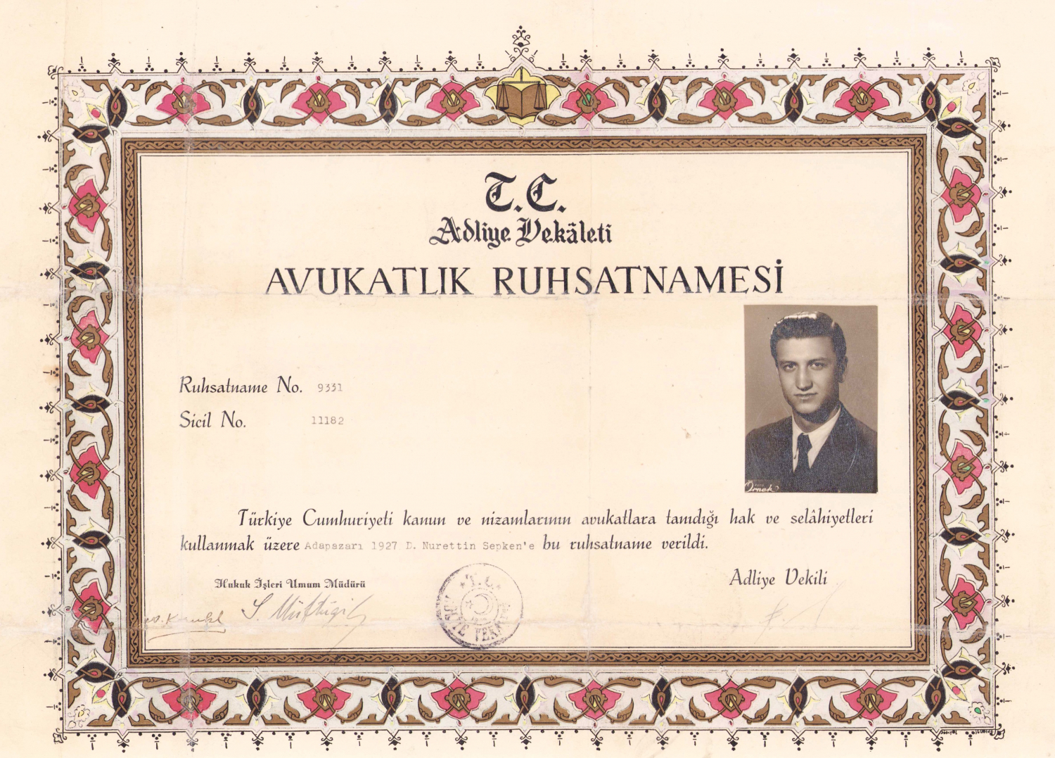 T. C. Adliye Vekaleti Avukatlık Ruhsatnamesi, pullu damgalı, ortadan tamirli haliyle, 43x32cm, Adapazarlı avukata ait