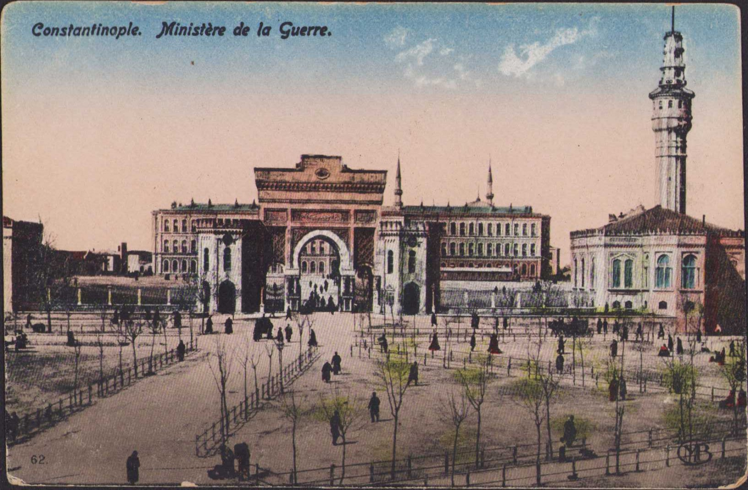 1908 yılında II. Meşrutiyet'in ilanından sonra Harbiye Nazırlığı olarak kullanılan bina, Beyazıt'ın eski hali, Fransızca yazılı