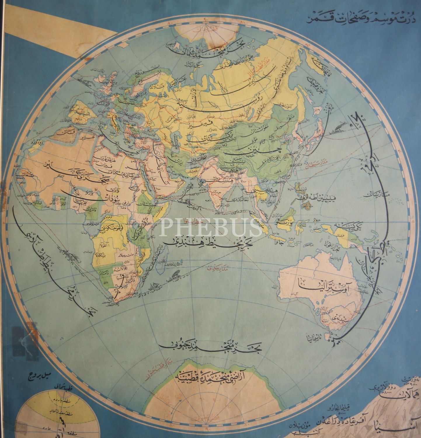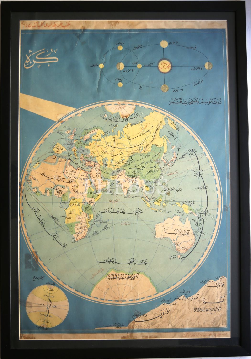 Mektep Haritaları Külliyatından Osmanlıca Dünya Haritası, Mürettib ve Muharriri: Mehmed Abdülkadir Osman Mükerrem, çerçeveli, 61x98 cm