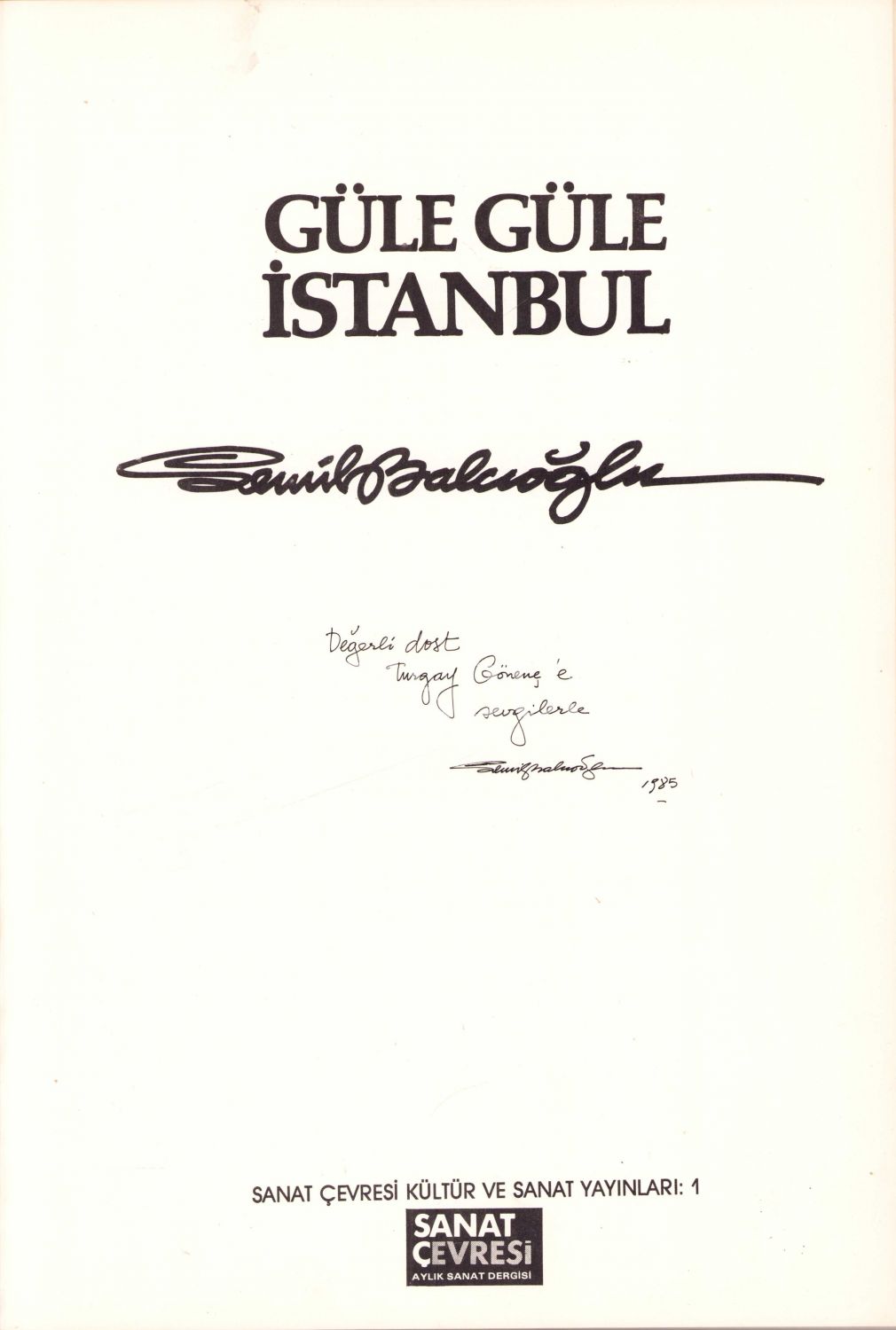 Güle Güle İstanbul, Semih Balcıoğlu'ndan Turgay Gönenç'e imzalı ve ithaflı, Sanat Çevresi Aylık Dergisi Yayınları:1, İstanbul, 1985,
