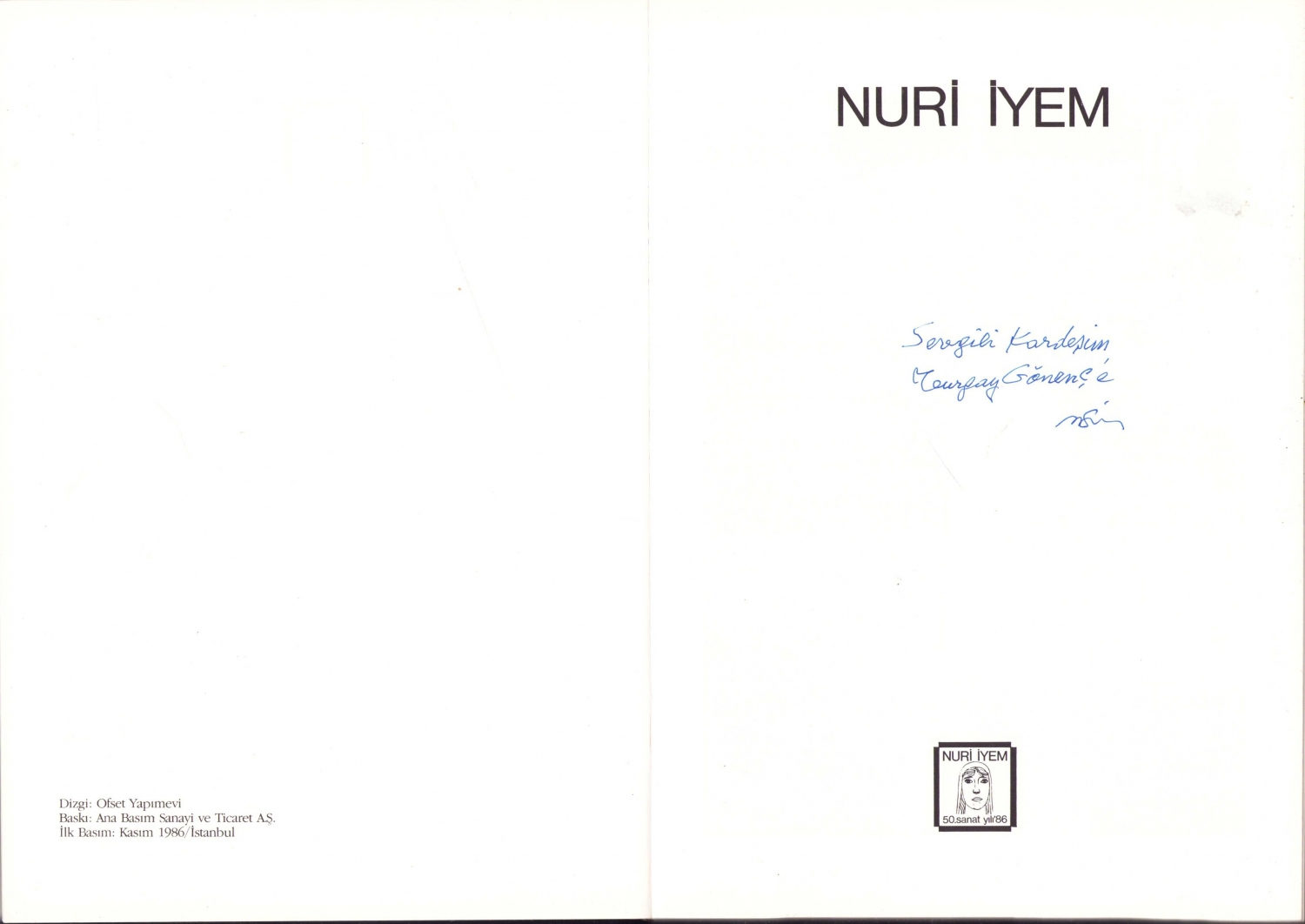 Nuri İyem, 50. Sanat Yılı, Nuri İyem'den Turgay Gönenç'e imzalı ve ithaflı, 155 sayfa, 19x28 cm