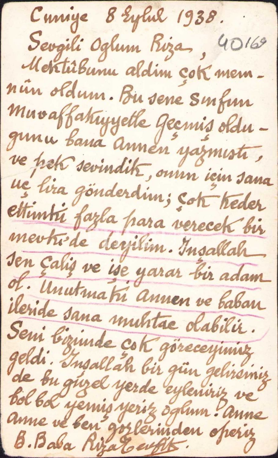 "Sevgili oğlum Rıza, Mektubunu aldım. Bu sene sınıfı muvaffakiyetle geçtiğini annen yazmıştı..."