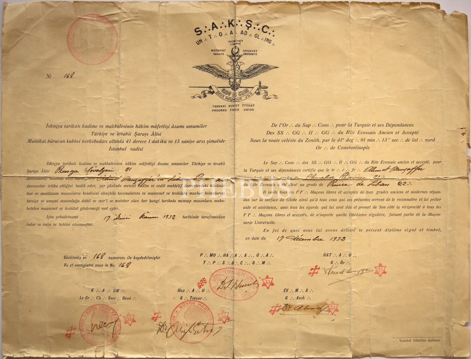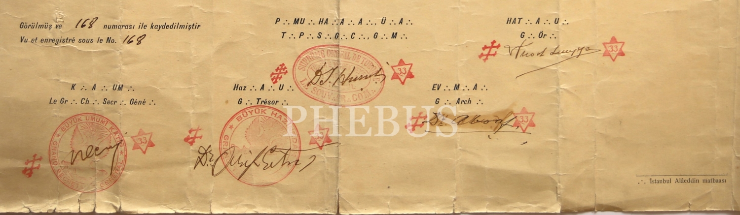 Türkiye ve Tevabii Şura-yı Alisi Mason Cemiyeti Terfi Belgesi, Fuat Süreyya [Paşa] ıslak imzalı, 1932 tarihli, 44x33 cm