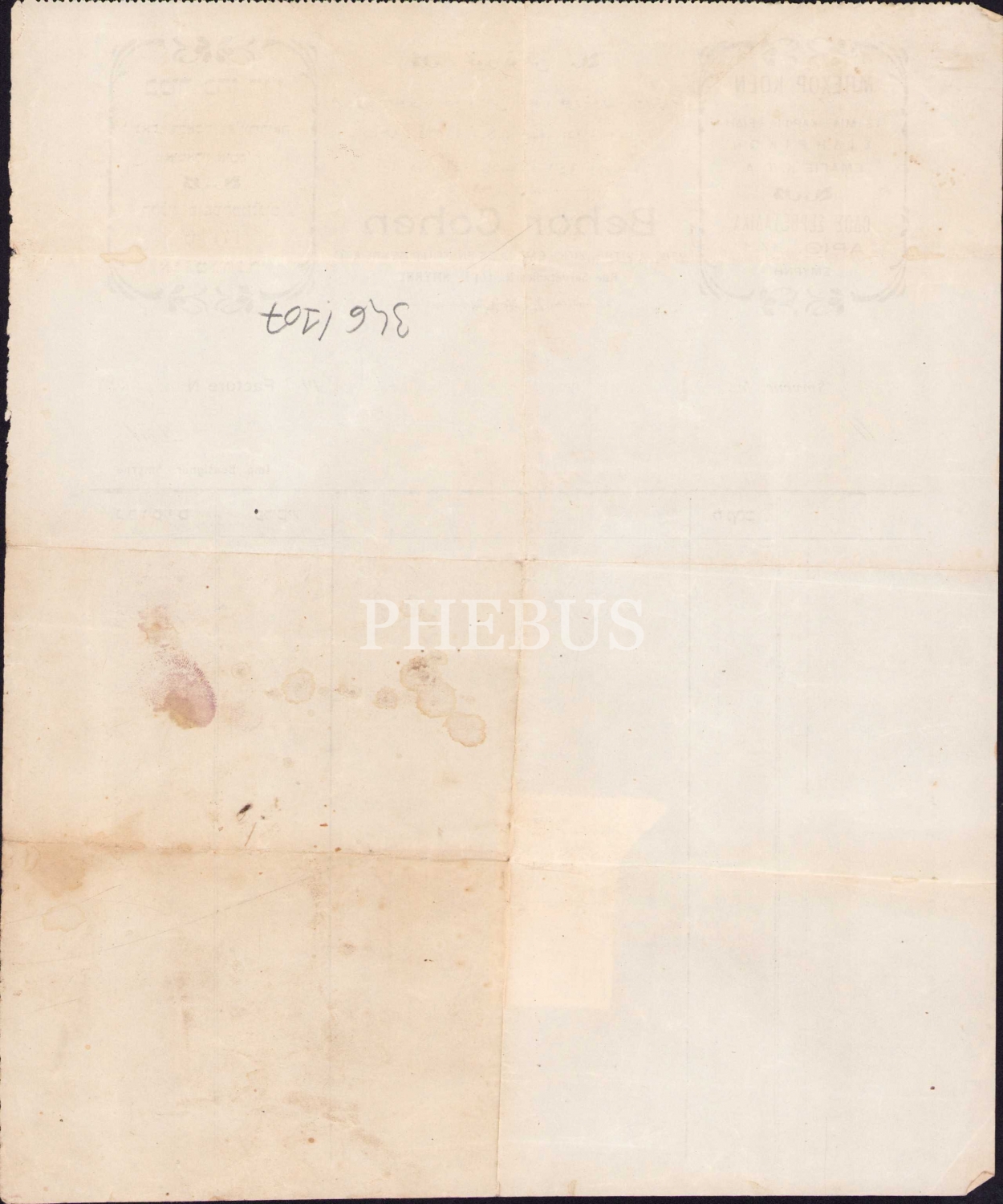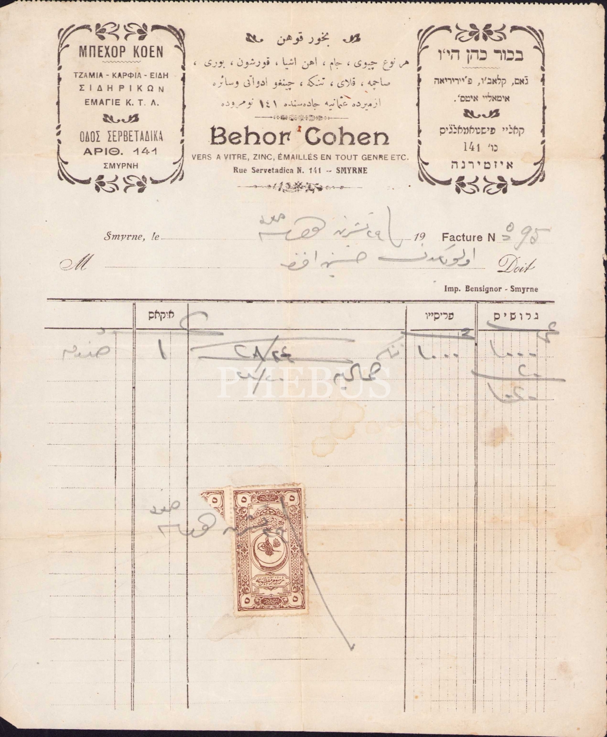 İzmir'de Behon Cohen Çivi, Cam, Eşya, Kurşun, Boru, Saçma, Kalay, Teneke, Çinko, Edevat-ı Saire Mağazası antetli, İbranice, Osmanlıca, Rumca, Fransızca, 4 dilde fatura, 21x26 cm
