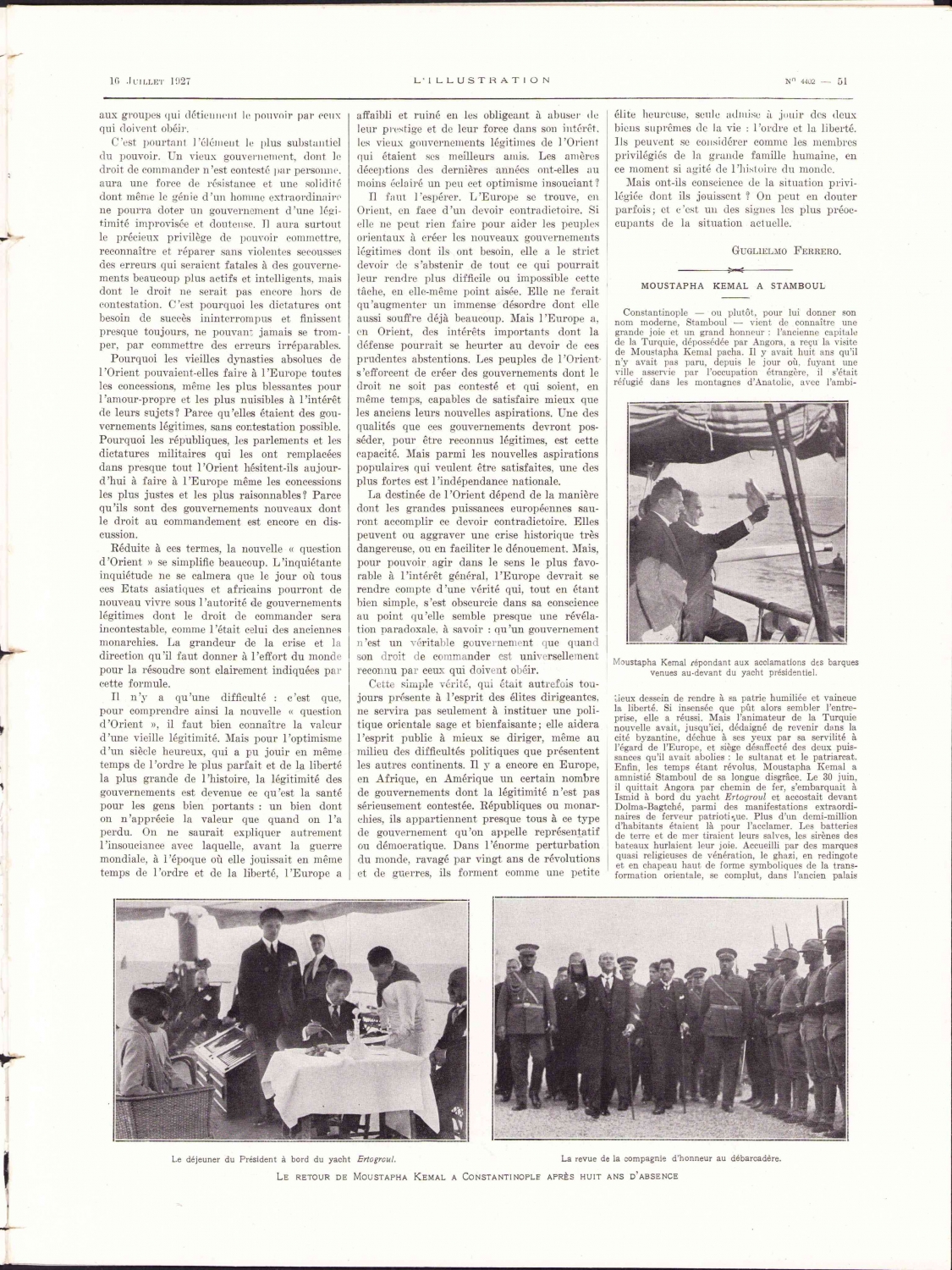 L'Ilustration Dergisi, Kapak: Mustafa Kemal Atatürk İstanbul'da, 16 Temmuz 1927 tarihli, 20 sayfa, Fransızca, 29x39 cm