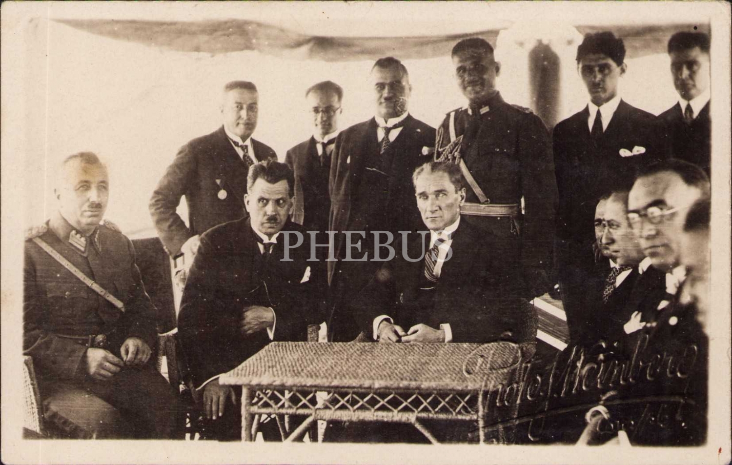 Mustafa Kemal Atatürk, Kılıç Ali, Cevat Abbas Gürer, Fahrettin Paşa ve Kazım Özalp, Mustafa Kemal Atatürk'ün 1 Temmuz 1927'de İstanbul'u teşrifleri esnasında, arkası 1929 tarihli "Gazi" imzalı.